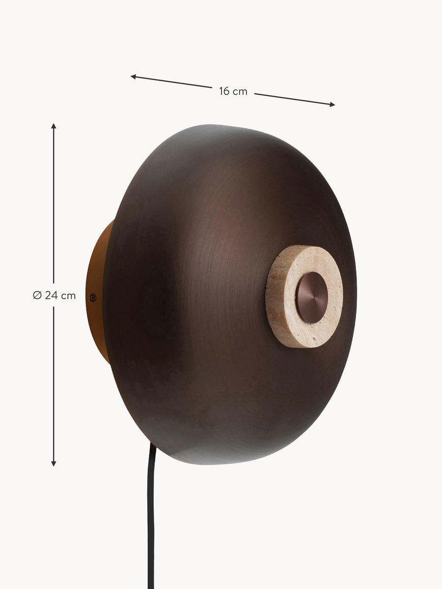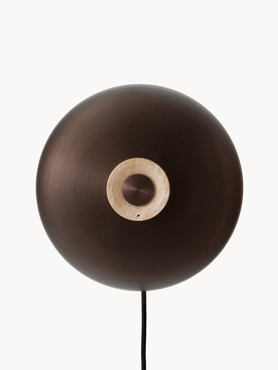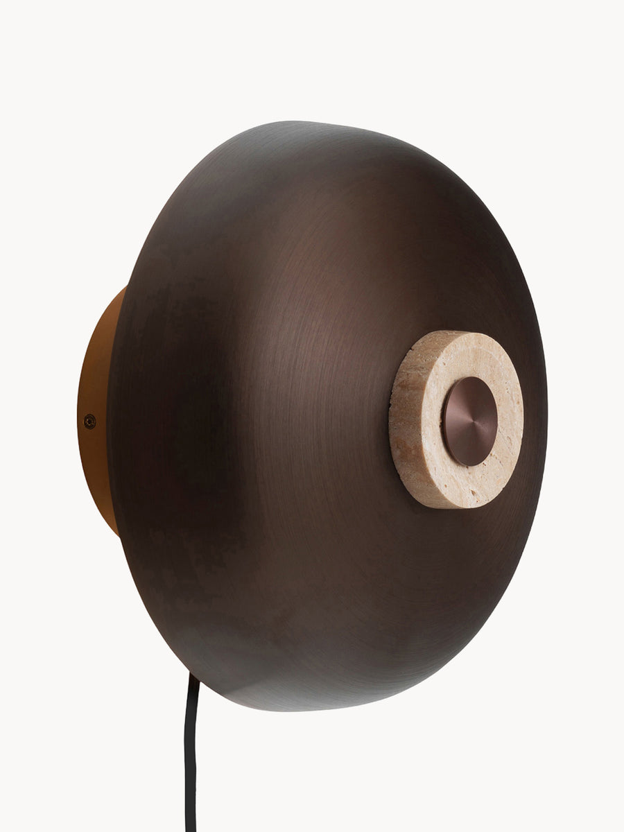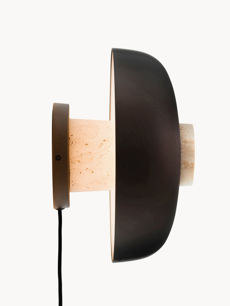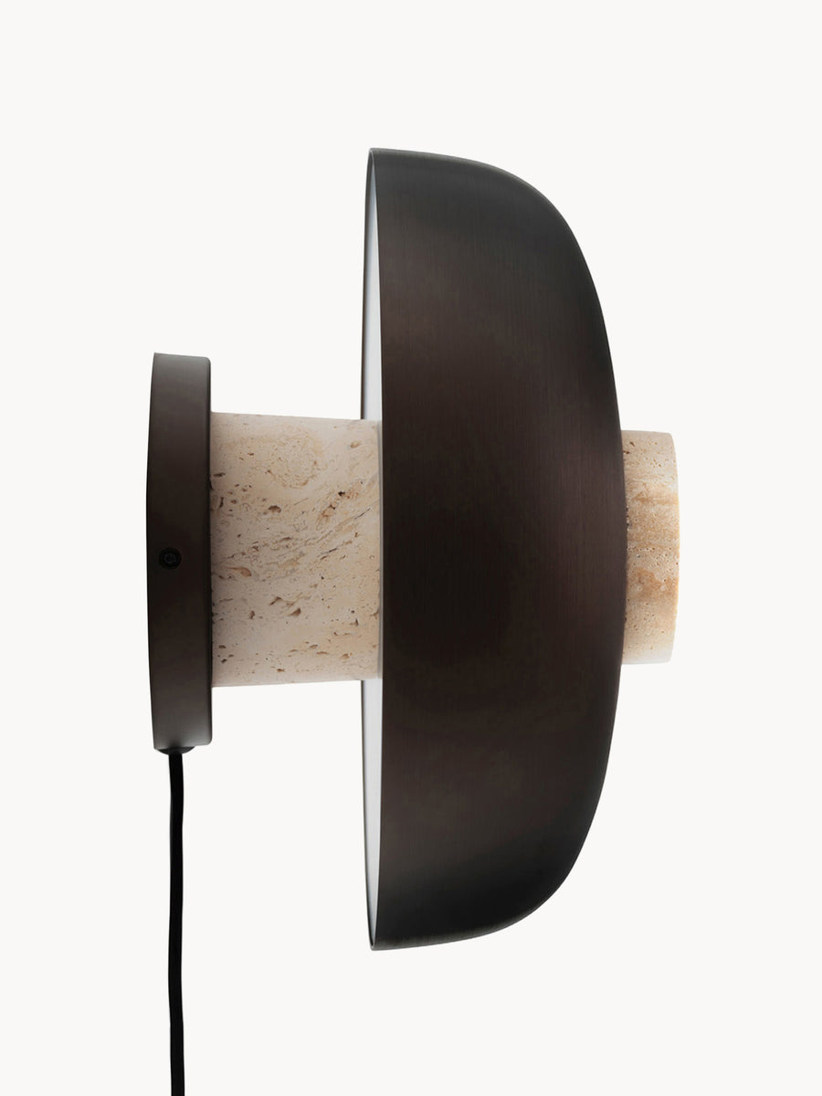 Efektowne połączenie surowych, naturalnych materiałów i wyrafinowanego rzemiosła, kinkiet REVERSE inspirowany jest zarówno napięciem, jak i harmonią, jakie tworzą ograniczenia geometryczne. Mocowanie do ściany lampy wykonane jest z nieobrobionego kamienia trawertynowego, uformowanego w stożkowy kształt z naturalnymi niedoskonałościami, które podkreślają piękno organicznych tekstur. Z drugiej strony zakrzywiony klosz wykonany jest z anodowanego brązowego aluminium o gładkim wykończeniu, które nadaje mu elegancki charakter. Lampa posiada opalizujący dyfuzor zapewniający równomierne rozpraszanie światła i wydobywający ciepłą poświatę.