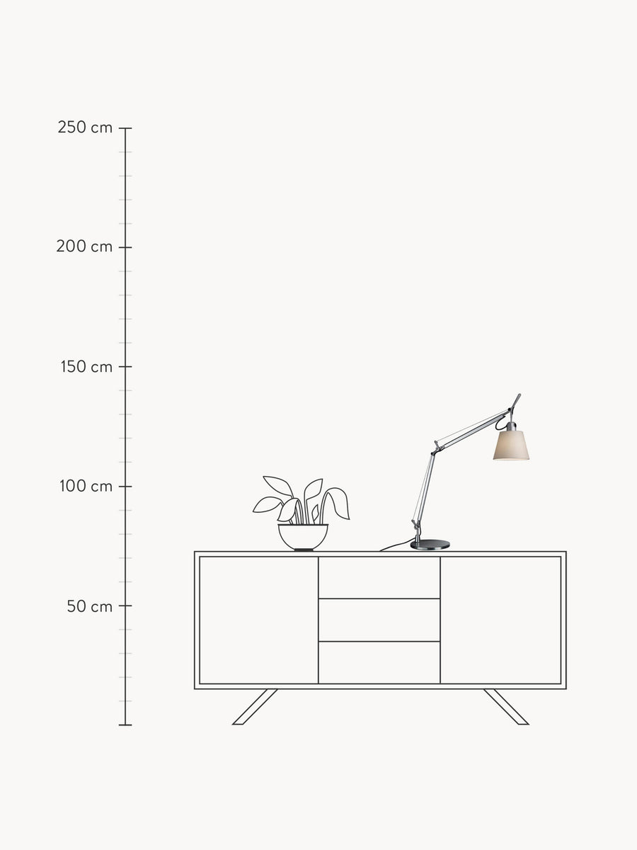 Regulowane ramiona ze sprężynowym systemem oraz regulowany klosz lampy są typowe dla rodziny lamp Tolomeo.