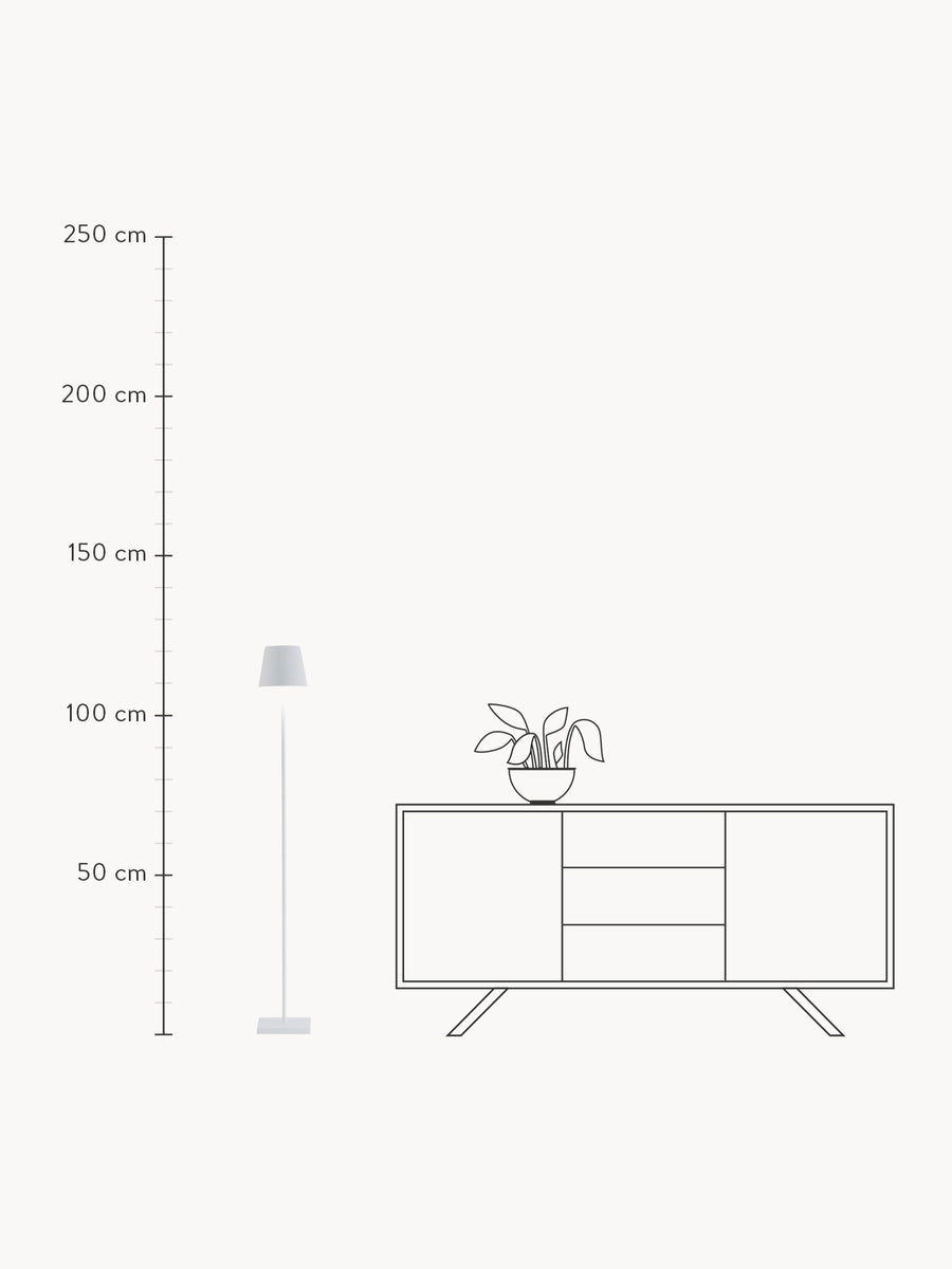 Ta lampa jest naprawdę wszechstronna i może być używana jako lampka stołowa lub podłogowa dzięki dołączonym przedłużanym prętom, które umożliwiają regulację na trzech różnych wysokościach. Dotykowy panel sterujący na górze lampy umożliwia włączanie i wyłączanie światła, regulację jasności oraz wybór barwy światła. Dzięki wysokiemu stopniowi ochrony IP lampa może być również używana na zewnątrz. System elektroniczny monitoruje i wskazuje pozostały poziom naładowania baterii, aby zapewnić optymalne ładowanie i zawsze prawidłowe jego wykonywanie. Lampa jest dostarczana z podstawą ładującą. Ładowarka USB nie jest dołączona.