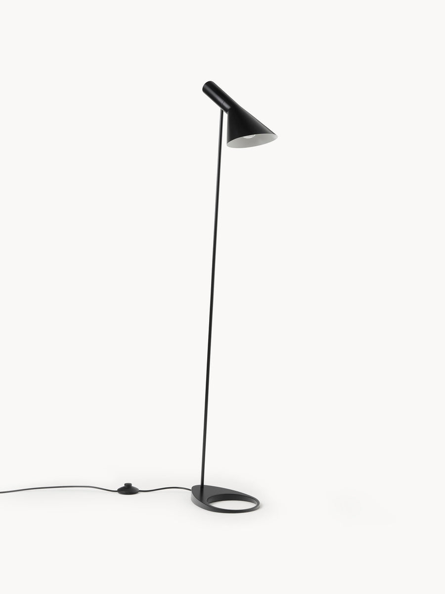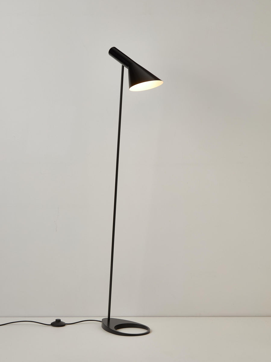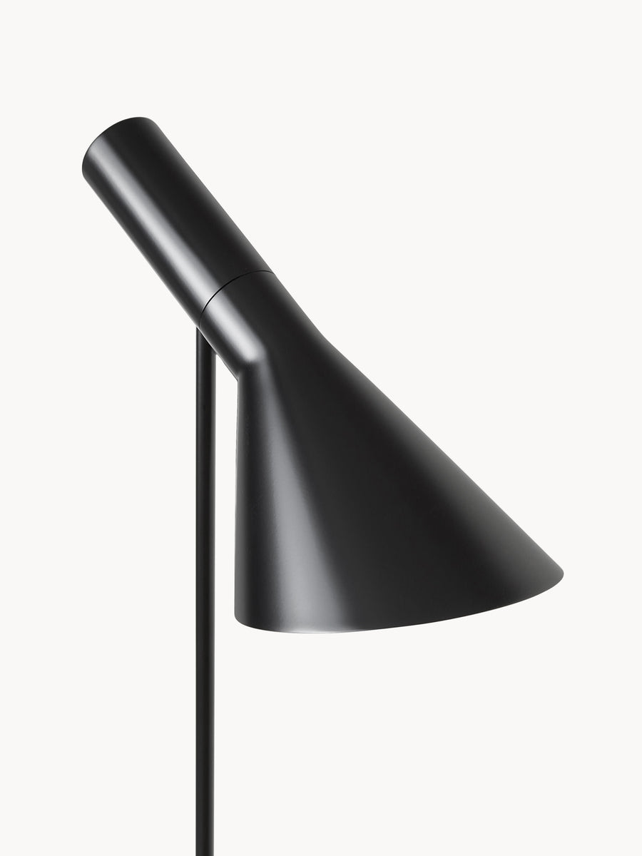 Lampa AJ została zaprojektowana w 1957 roku dla hotelu SAS Royal w Kopenhadze i jest legendarnym projektem Arne Jacobsena. Charakteryzuje się graficznym i stylistycznie czystym wyrazem, nadając lampie ponadczasowy wygląd, który można łączyć z różnymi odcieniami kolorystycznymi, zgodnie z nowoczesnymi trendami w aranżacji wnętrz. Lampa podłogowa AJ emituje światło skierowane w dół. Nachylenie klosza można dostosować do własnych potrzeb. Wnętrze klosza jest w kolorze białym, co zapewnia równomierne, miękkie światło.
