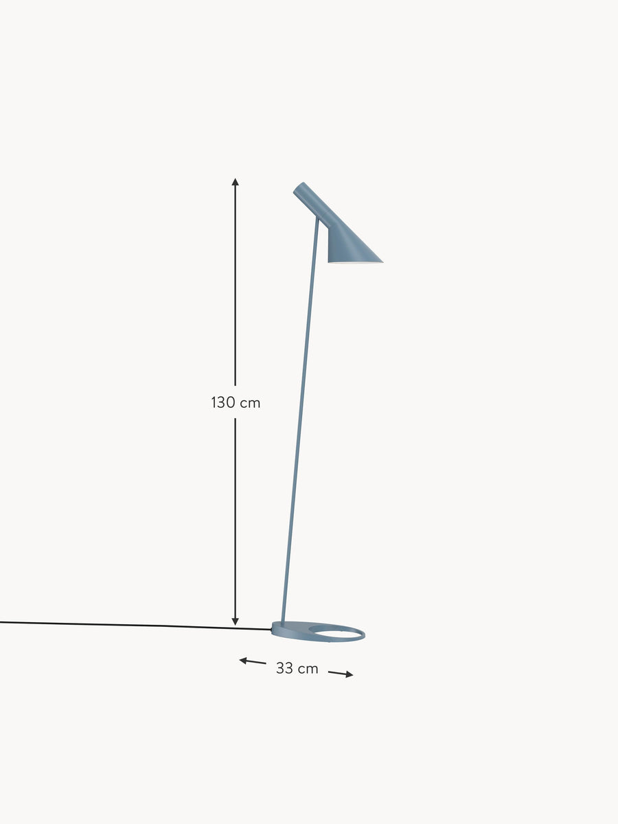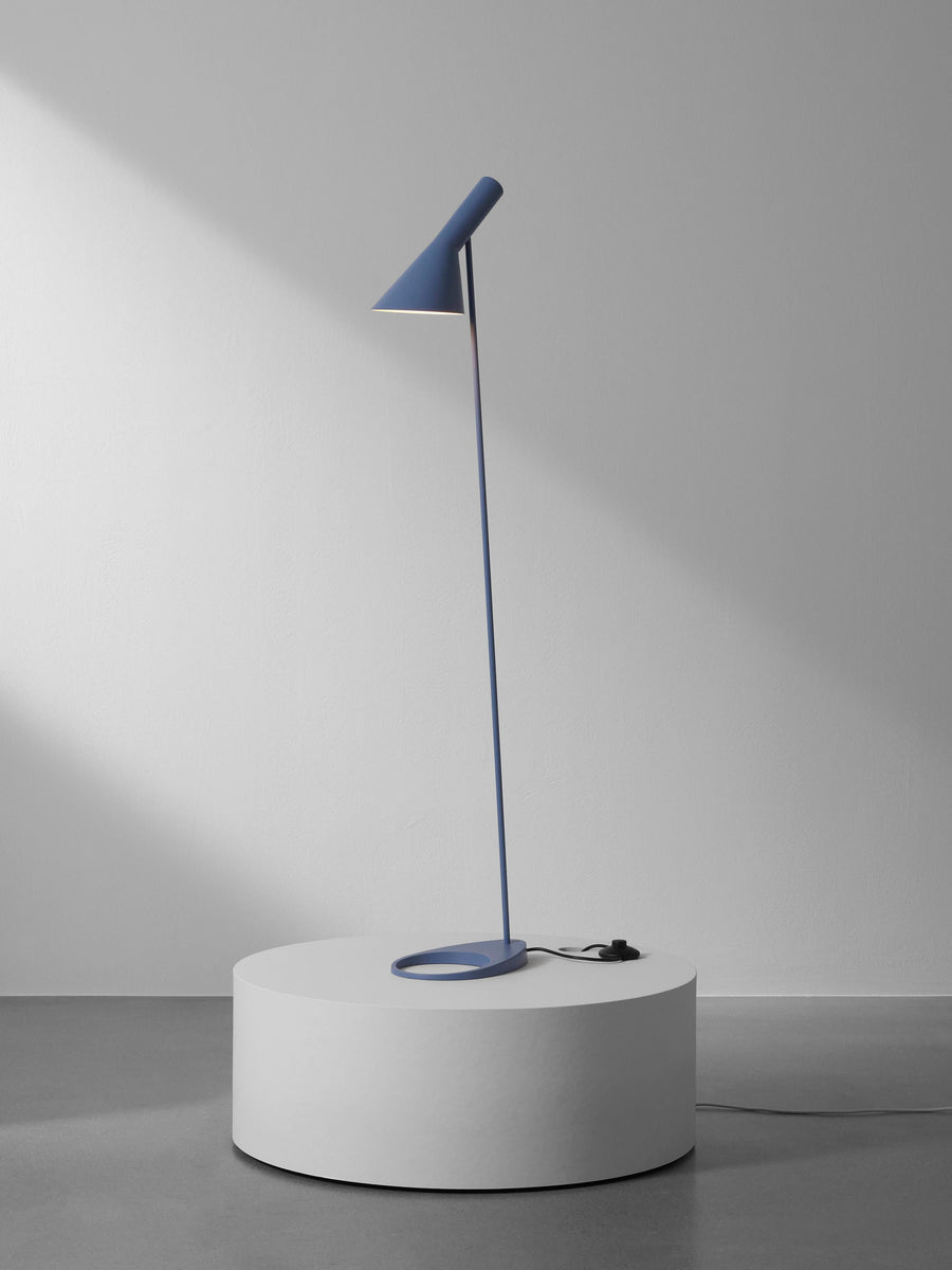 Lampa AJ została zaprojektowana w 1957 roku dla hotelu SAS Royal w Kopenhadze i jest legendarnym projektem Arne Jacobsena. Charakteryzuje się graficznym i stylistycznie czystym wyrazem, nadając lampie ponadczasowy wygląd, który można łączyć z różnymi odcieniami kolorystycznymi, zgodnie z nowoczesnymi trendami w aranżacji wnętrz. Lampa podłogowa AJ emituje światło skierowane w dół. Nachylenie klosza można dostosować do własnych potrzeb. Wnętrze klosza jest w kolorze białym, co zapewnia równomierne, miękkie światło.