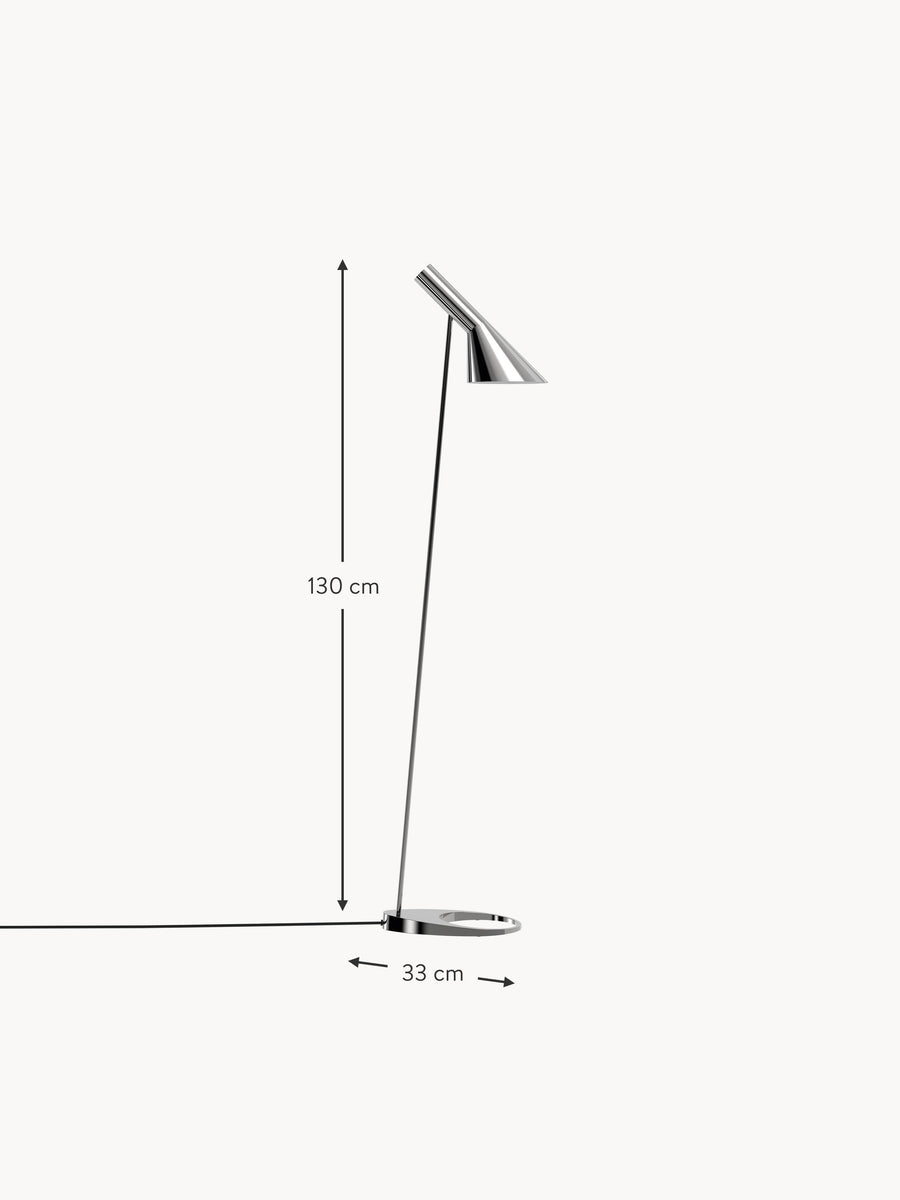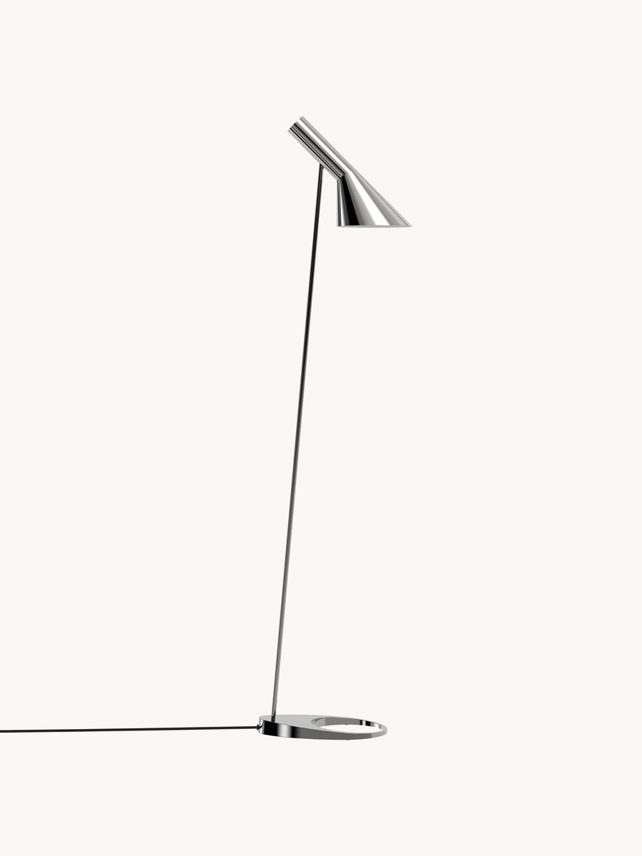 Lampa AJ została zaprojektowana w 1957 roku dla hotelu SAS Royal w Kopenhadze i jest legendarnym projektem Arne Jacobsena. Charakteryzuje się graficznym i stylistycznie czystym wyrazem, nadając lampie ponadczasowy wygląd, który można łączyć z różnymi odcieniami kolorystycznymi, zgodnie z nowoczesnymi trendami w aranżacji wnętrz. Lampa podłogowa AJ emituje światło skierowane w dół. Nachylenie klosza można dostosować do własnych potrzeb. Wnętrze klosza jest w kolorze białym, co zapewnia równomierne, miękkie światło.