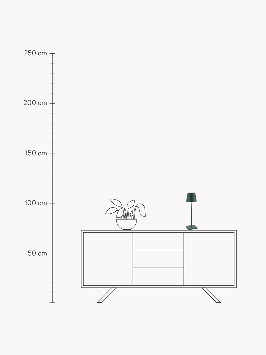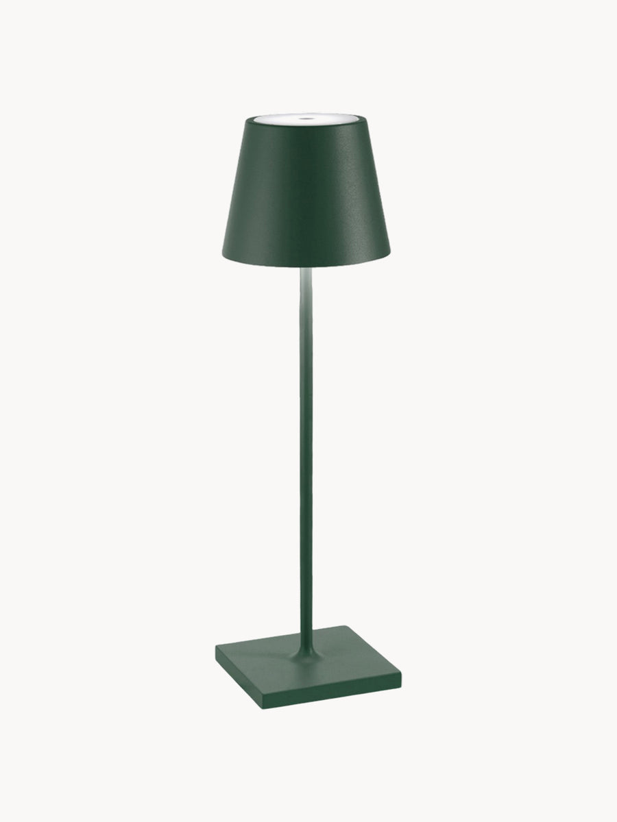 Bezprzewodowa, akumulatorowa lampa stołowa. Dotykowy panel na górnej części lampy umożliwia włączanie i wyłączanie światła, a także regulację jasności i wybór barwowy światła. Dzięki wysokiej klasie ochrony IP lampę można również używać na zewnątrz. System elektroniczny monitoruje i wskazuje pozostały poziom naładowania baterii, aby zapewnić optymalne ładowanie. Lampa jest dostarczana z podstawą ładującą. Ładowarka USB nie jest dołączona.