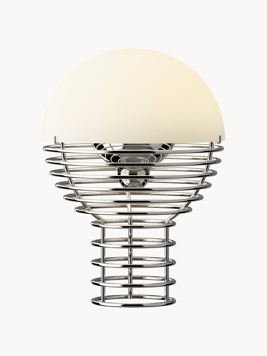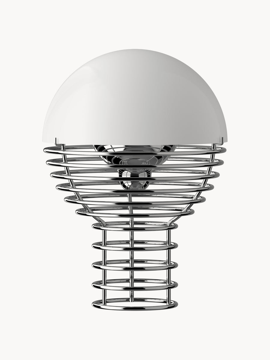 Kolekcja WIRE to hołd dla rzeźbiarskiej lekkości i ponadczasowego designu. Stworzona przez Vernera Pantona w Danii stalowa rama z wdziękiem rozszerza się, aby podtrzymać klosz, a półkulasty odbłyśnik kieruje światło LED w kierunku delikatnej, przyjemnej poświaty. Dzięki akumulatorowi i wszechstronności WIRE z łatwością przechodzi pomiędzy przestrzeniami wewnętrznymi i zewnętrznymi, oferując kultową, ale dyskretną obecność w każdym otoczeniu.