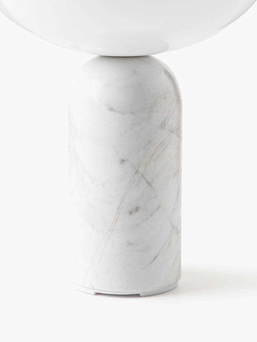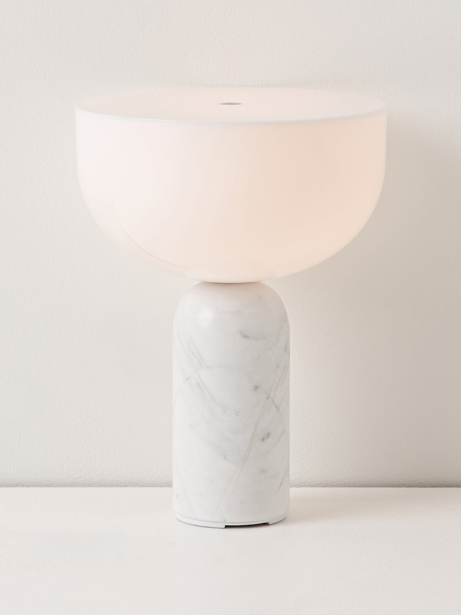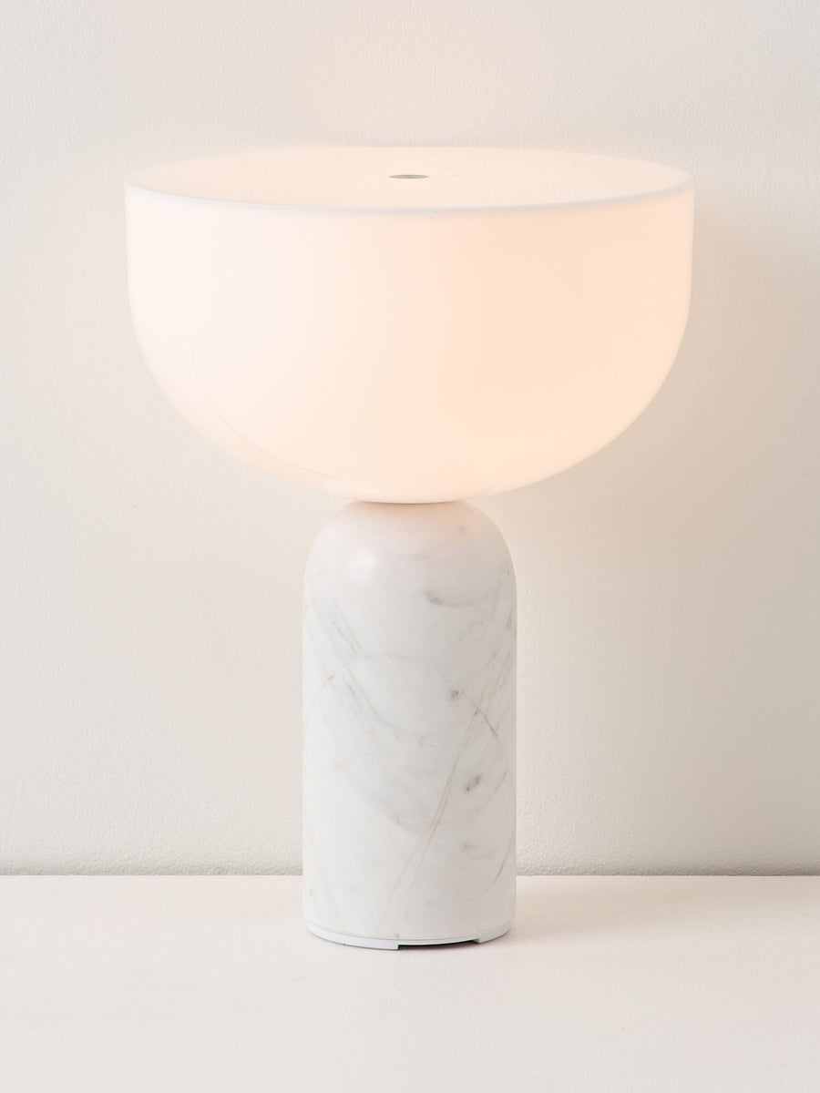 Marmurowa podstawa zapewnia lampie naturalną stabilność, a polerowana powierzchnia jest przyjemna w dotyku. Światło emituje z całej górnej części lampy, zapewniając imponującą jasność pomimo niewielkich rozmiarów. Precyzyjnie osadzony metalowy pierścień u góry stanowi wyrafinowany detal konstrukcyjny i służy również jako mechanizm przyciemniający: światło można przyciemniać w trzech stopniach, delikatnie dotykając pierścienia.