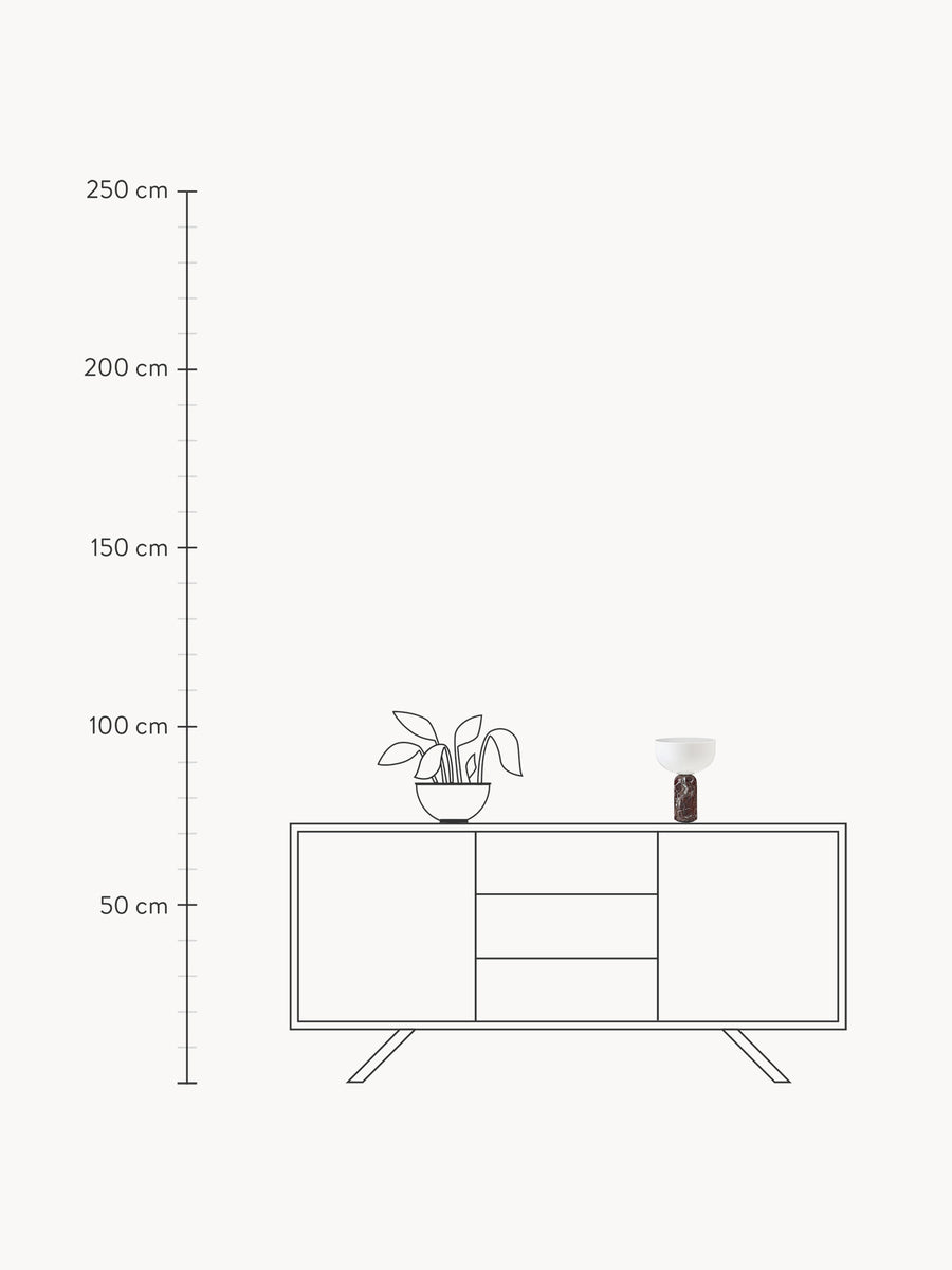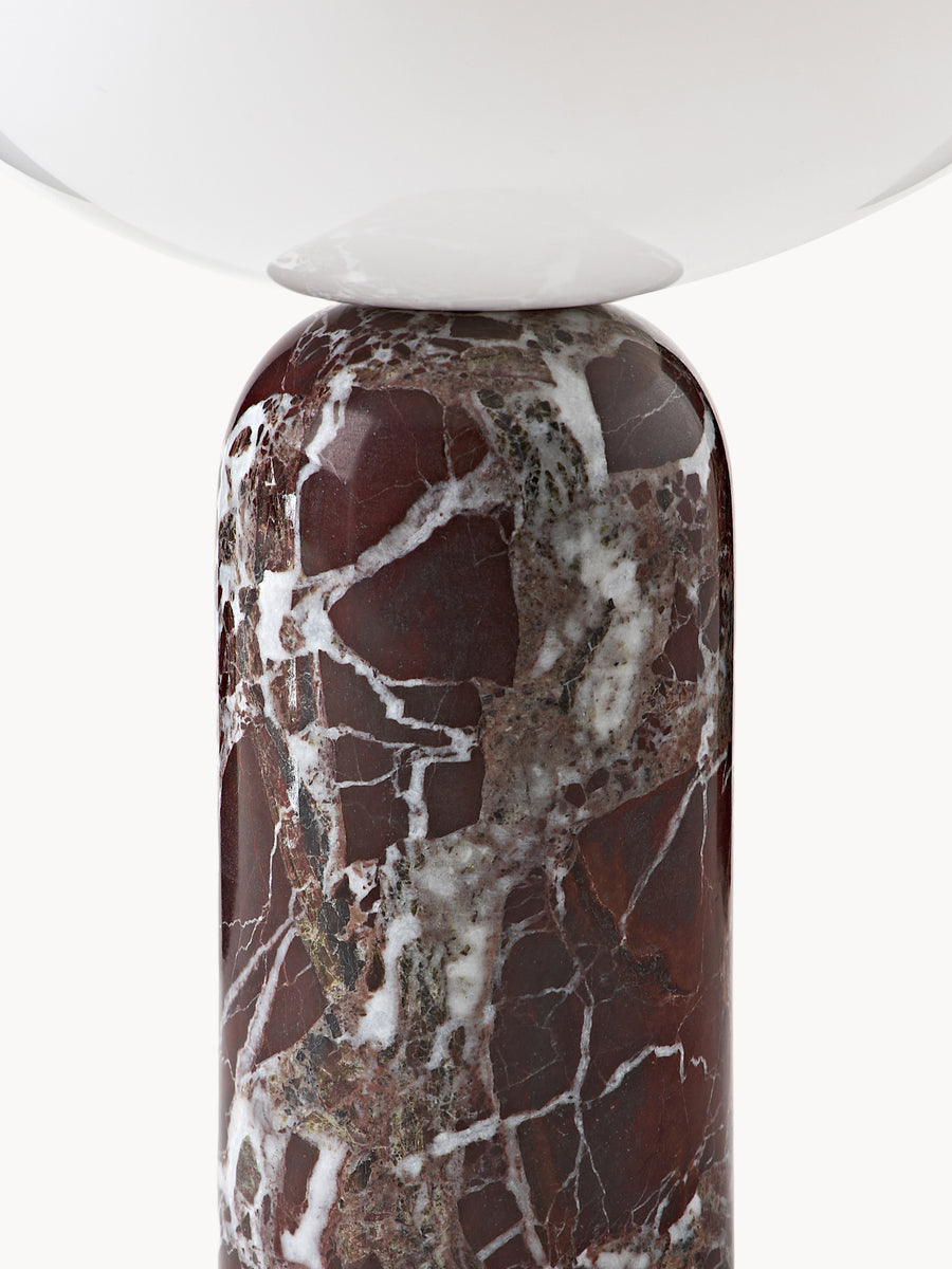 Marmurowa podstawa gwarantuje naturalną stabilność, a jej polerowana powierzchnia przyjemnie leży w dłoni. Światło emanuje z całej górnej części oprawy, oferując imponującą jasność mimo niewielkich rozmiarów. Precyzyjnie osadzony metalowy pierścień na szczycie dodaje eleganckiego akcentu i pełni funkcję ściemniacza – intensywność światła można regulować w trzech stopniach za pomocą delikatnego dotyku.