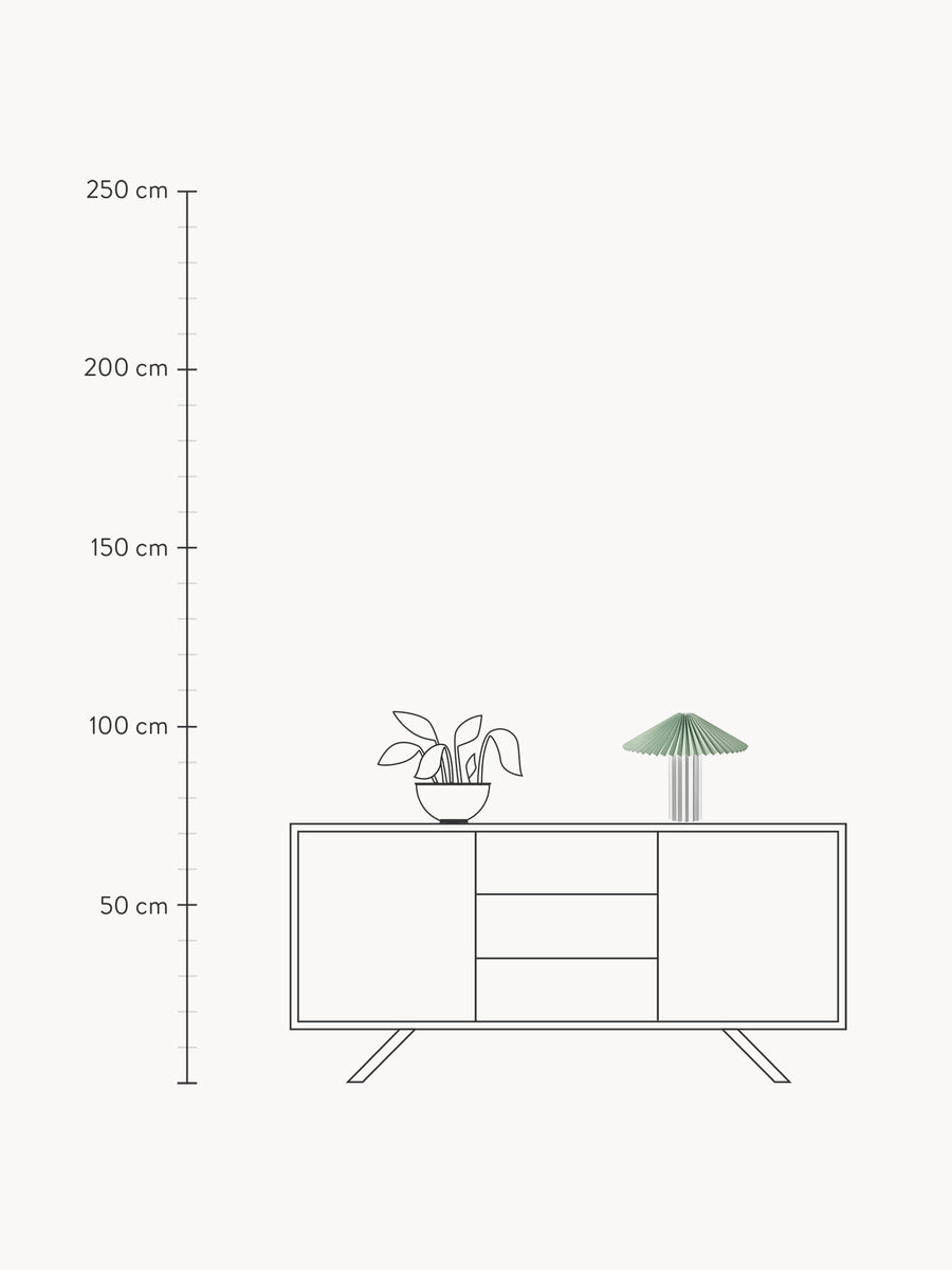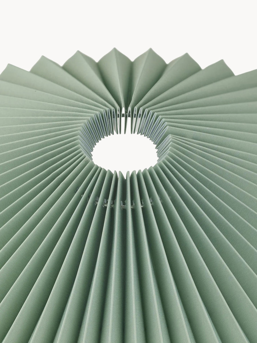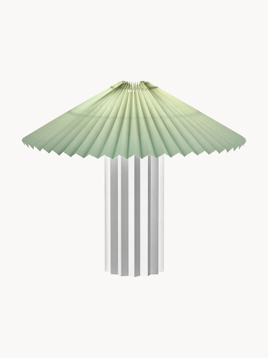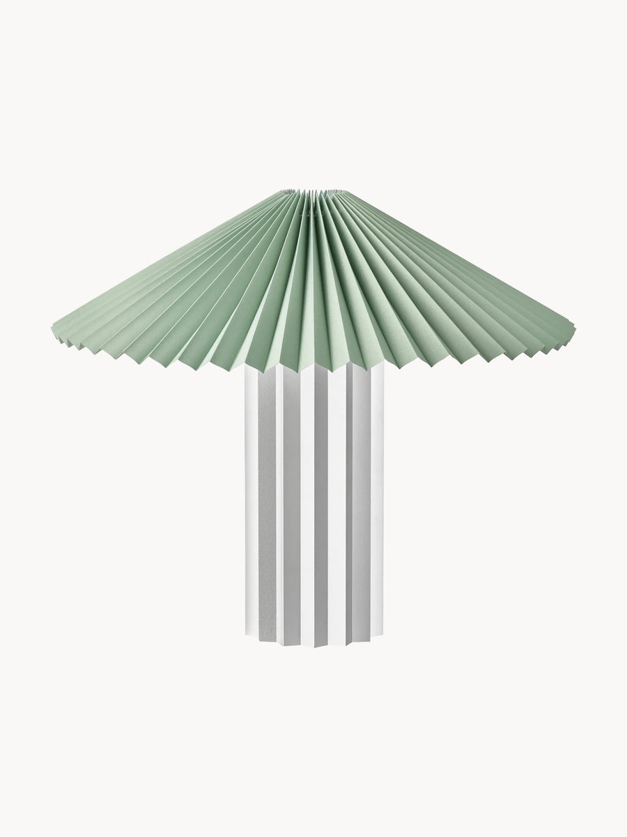 Lampa stołowa TAITE na nowo interpretuje klasyczną lampę z plisowanym kloszem. Kontrastujące ze sobą materiały – tekstylny klosz w styl retro i nowoczesna aluminiowa podstawa – nadają lampie zaskakująco nowoczesny wygląd. Wyrafinowany plisowany wygląd aluminium odbija światło i tworzy ekscytującą grę świateł i cieni. Spód klosza wykonany jest z białego, wytrzymałego tworzywa sztucznego, które jest plisowane, tworząc efekt plisowania. Dzięki temu górna część klosza jest stabilna wymiarowo.