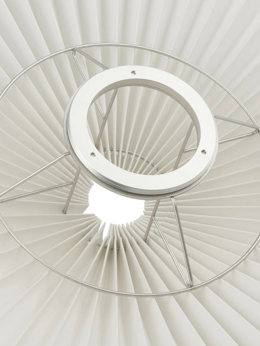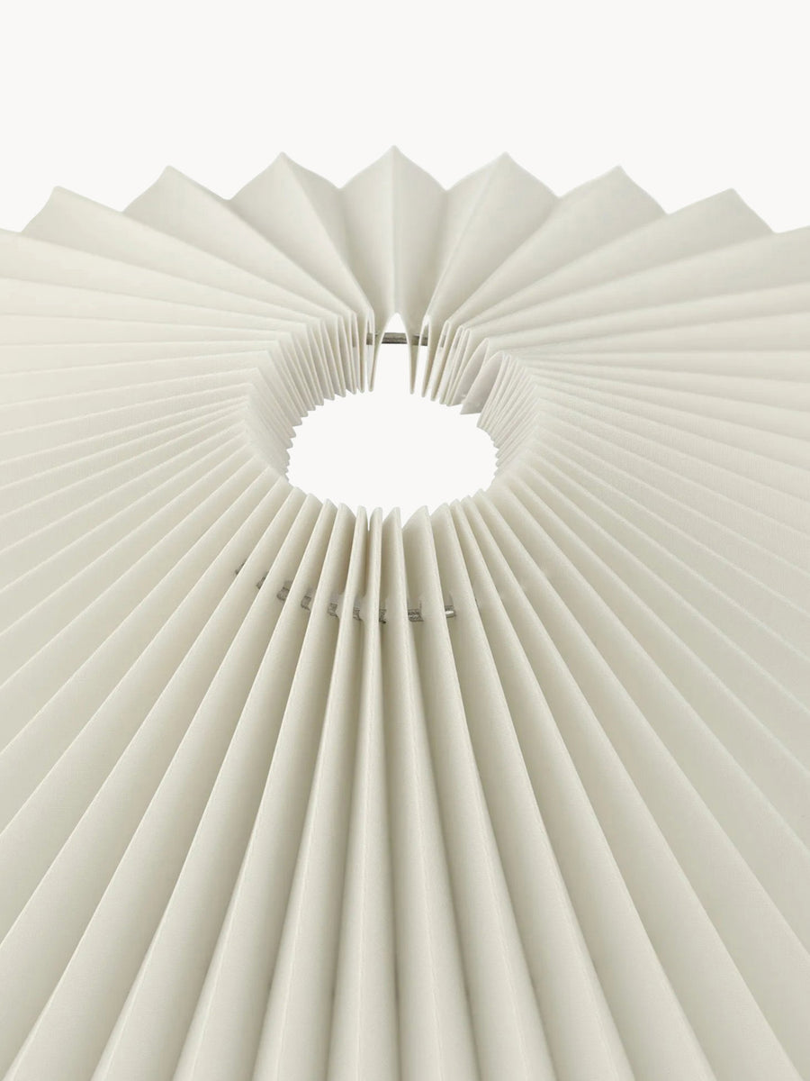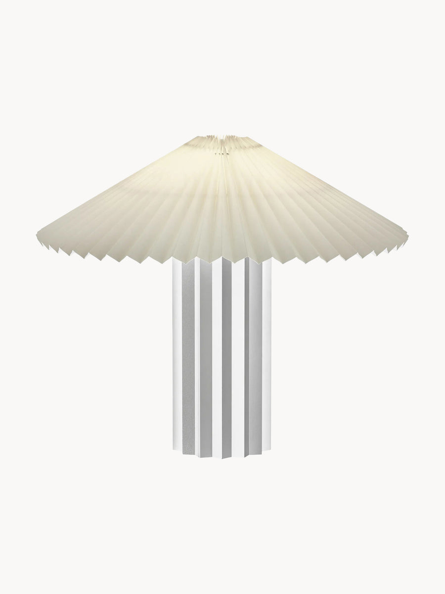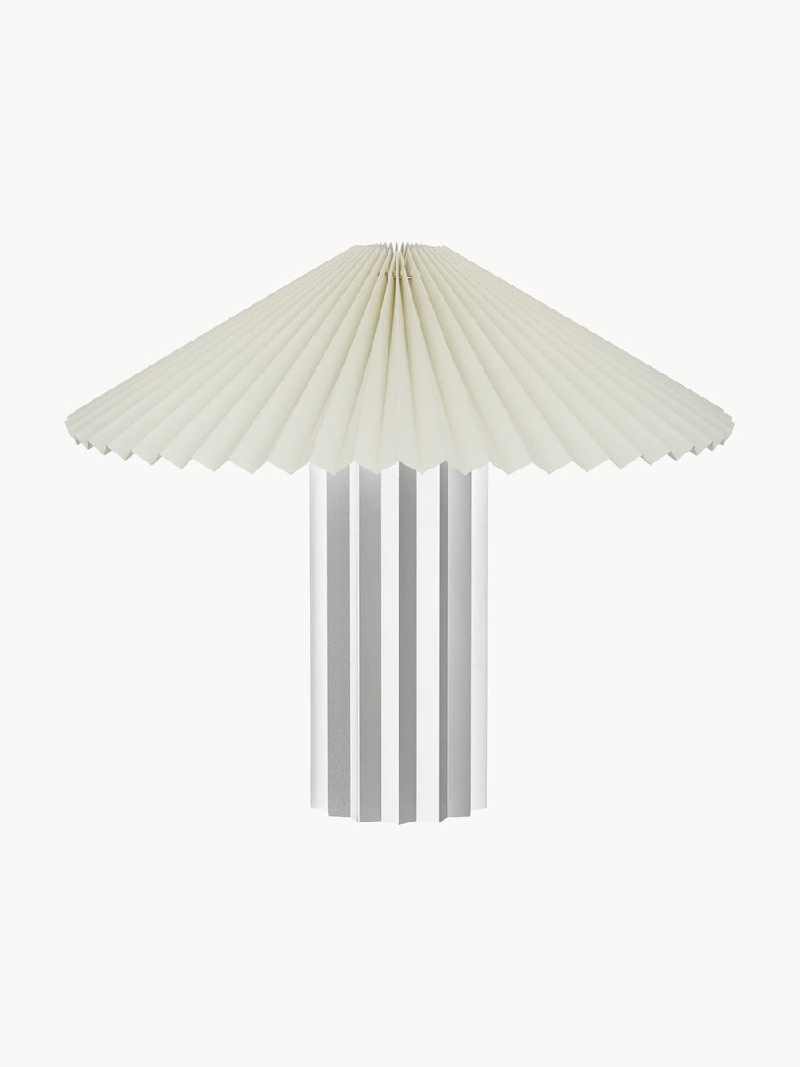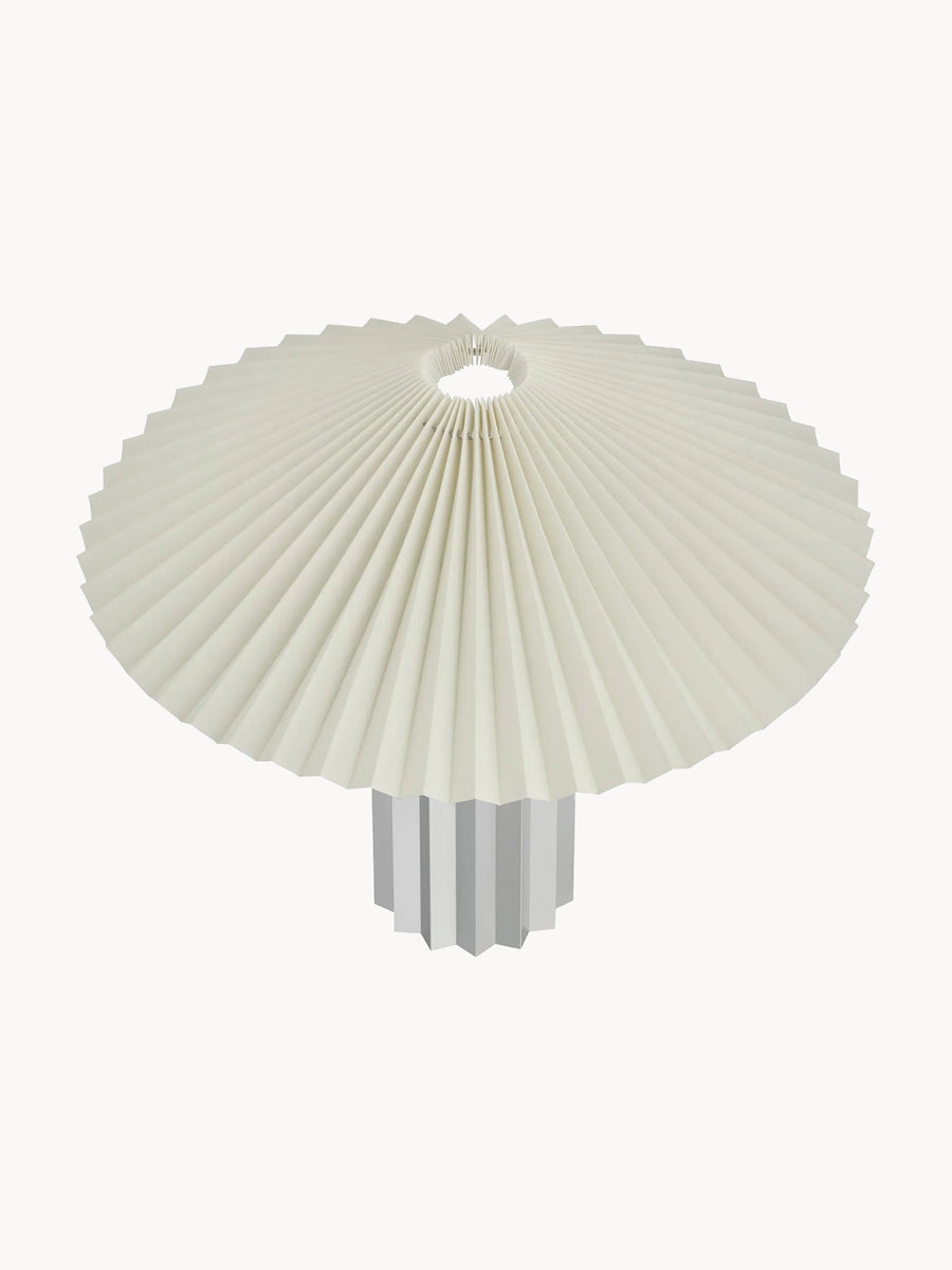 Lampa stołowa TAITE na nowo interpretuje klasyczną lampę z plisowanym kloszem. Kontrastujące ze sobą materiały – tekstylny klosz w styl retro i nowoczesna aluminiowa podstawa – nadają lampie zaskakująco nowoczesny wygląd. Wyrafinowany plisowany wygląd aluminium odbija światło i tworzy ekscytującą grę świateł i cieni. Spód klosza wykonany jest z białego, wytrzymałego tworzywa sztucznego, które jest plisowane, tworząc efekt plisowania. Dzięki temu górna część klosza jest stabilna wymiarowo.