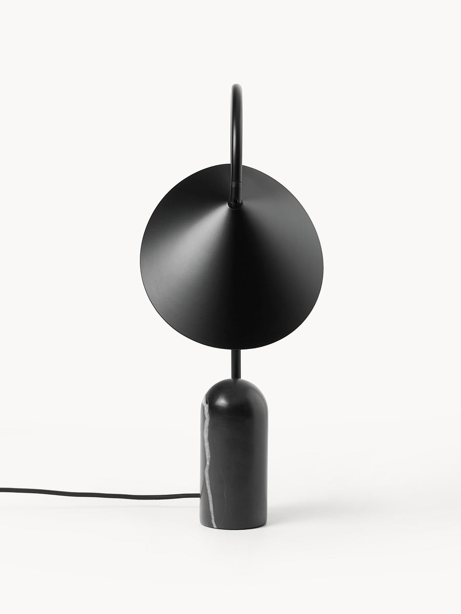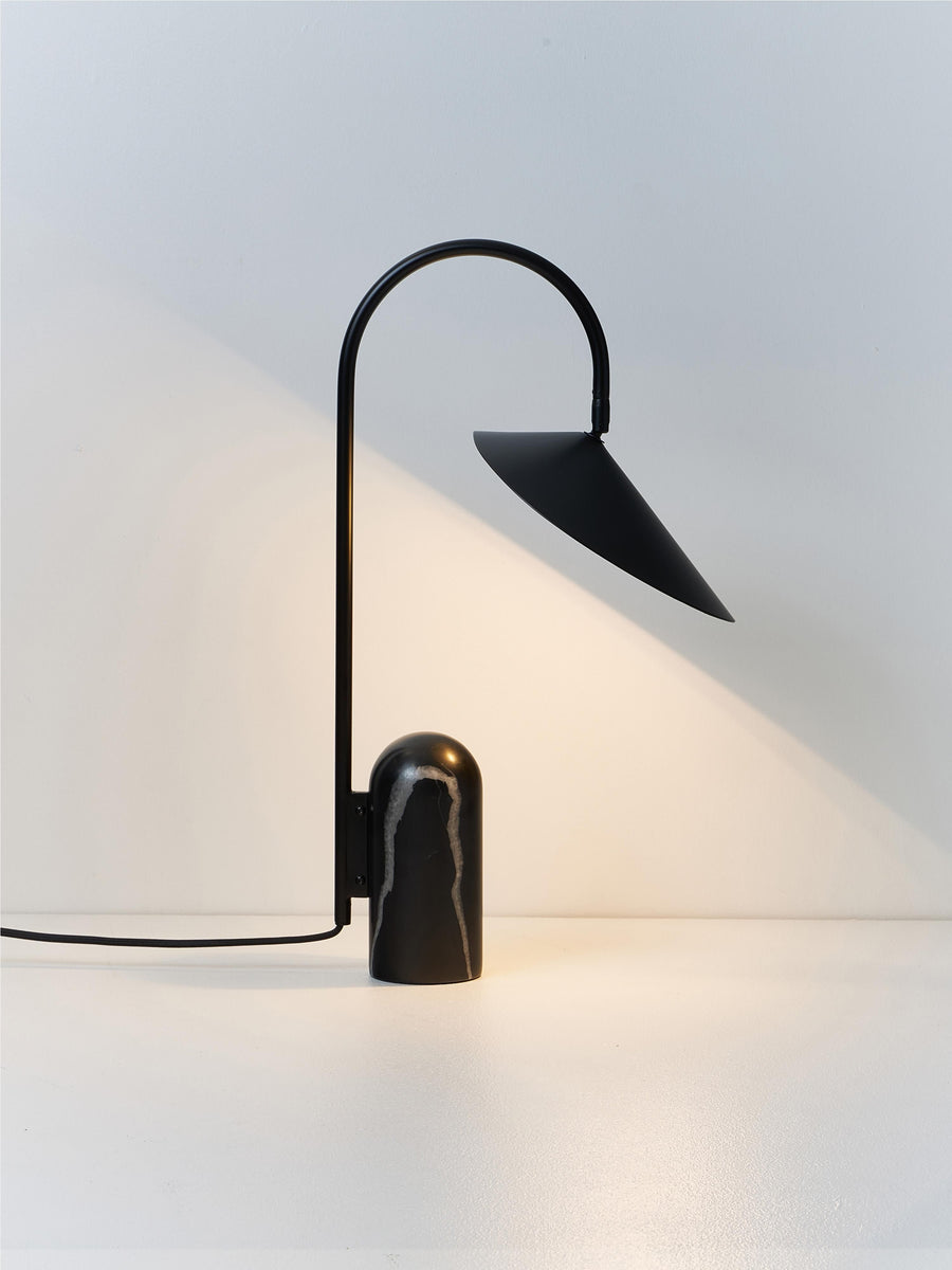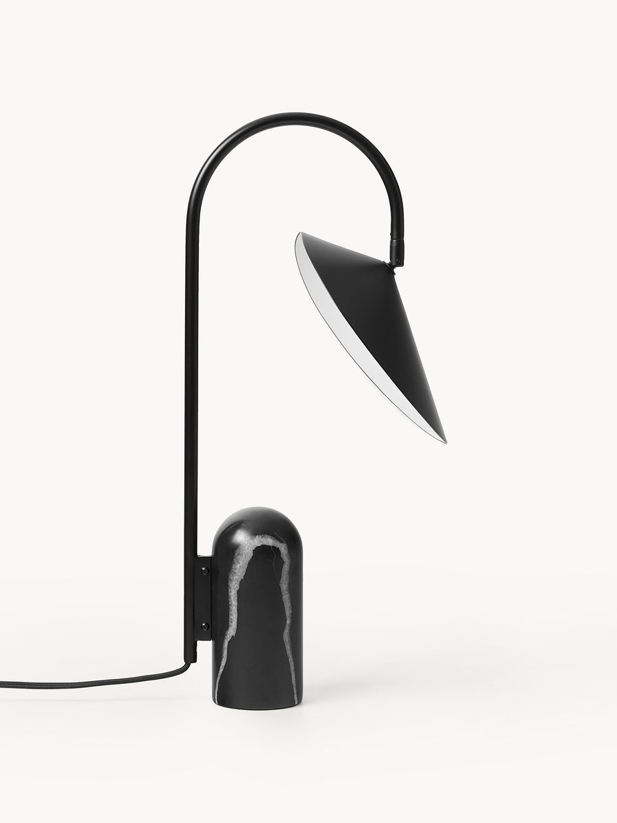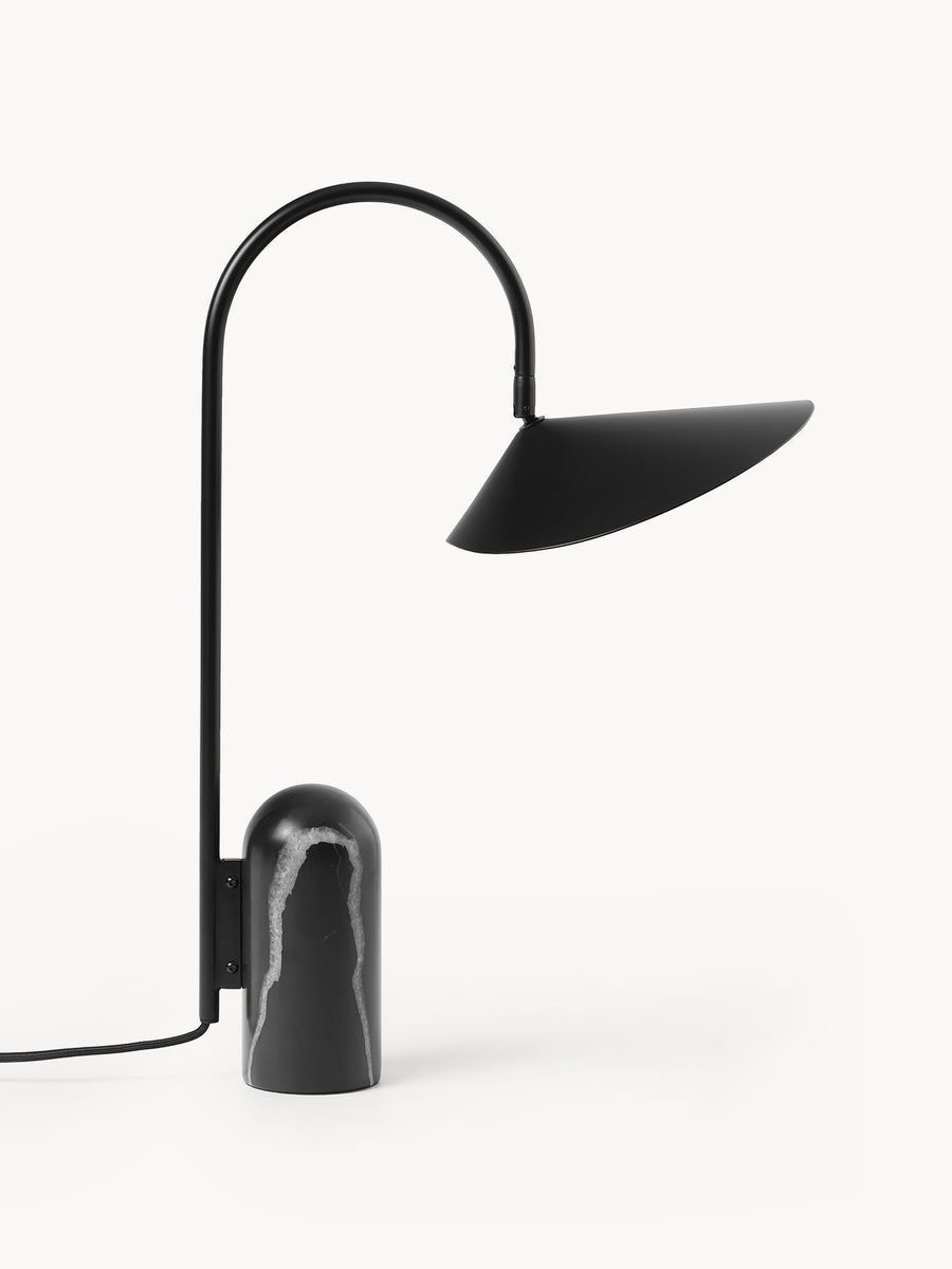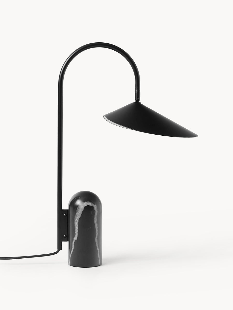 Arum charakteryzuje się solidną trawertynową podstawą w połączeniu z organicznie ukształtowanym kloszem. Aby osiągnąć idealną równowagę w strukturze lampy, kamienna podstawa stanowi przeciwwagę dla delikatnego sposobu, w jaki klosz zwisa z metalowego łuku – jak liść na łodydze. Dzięki matowemu wnętrzu klosza, lampa zapewnia delikatne, równomiernie rozproszone światło.