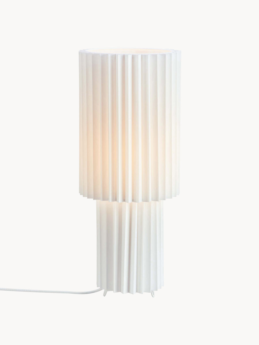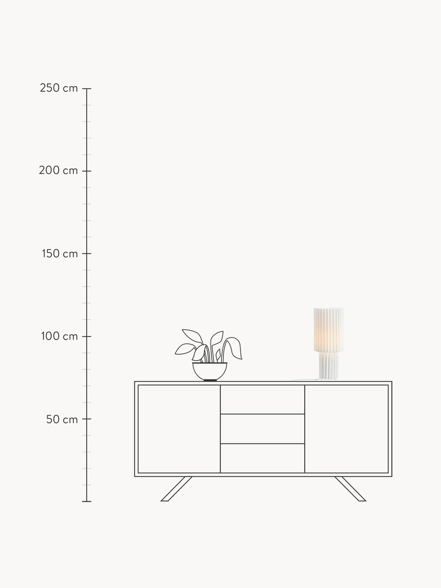 Dekoracyjna lampa stołowa z plisowanym korpusem i tekstylnym kloszem. Lampa emituje piękne światło przez plisowanie klosza. CATIS idealnie sprawdzi się na oknie, stoliku pomocniczym lub jako lampka nocna.