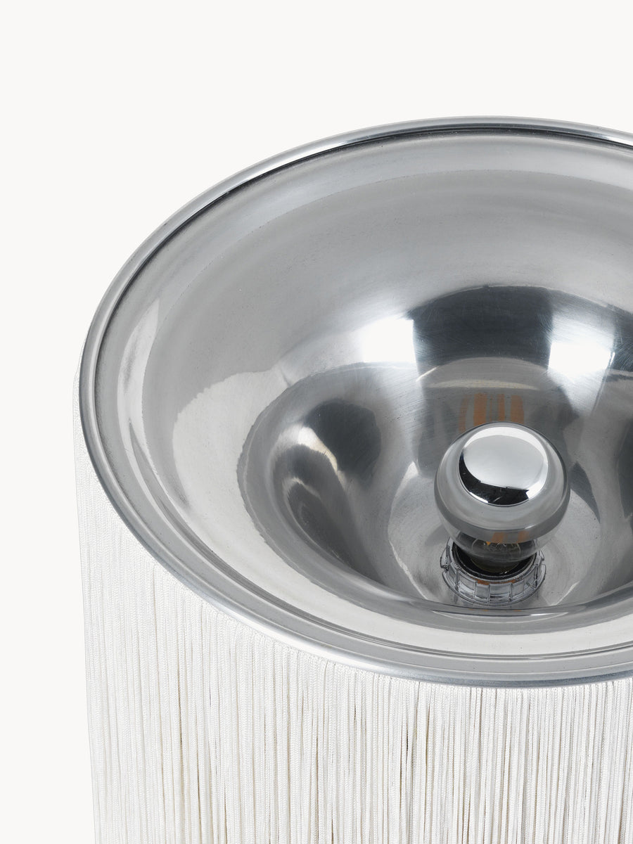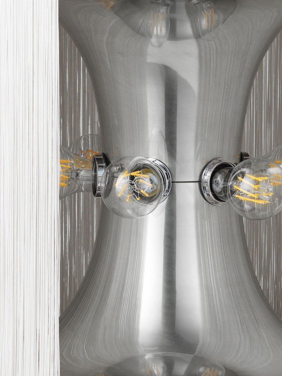 Dzięki rozmieszczeniu żarówek MODEL 597 zapewnia 360º rozsył pośredniego światła, które jest przyjemne dla oka dzięki frędzlom, a aluminiowa osłona zwiększa ciepło światła. Lekkość wyrazu, a jednocześnie powaga funkcji MODEL 597 wnosi do wnętrz wyrafinowanie, urok i charakter, nie polegając na zbędnych dekoracjach.