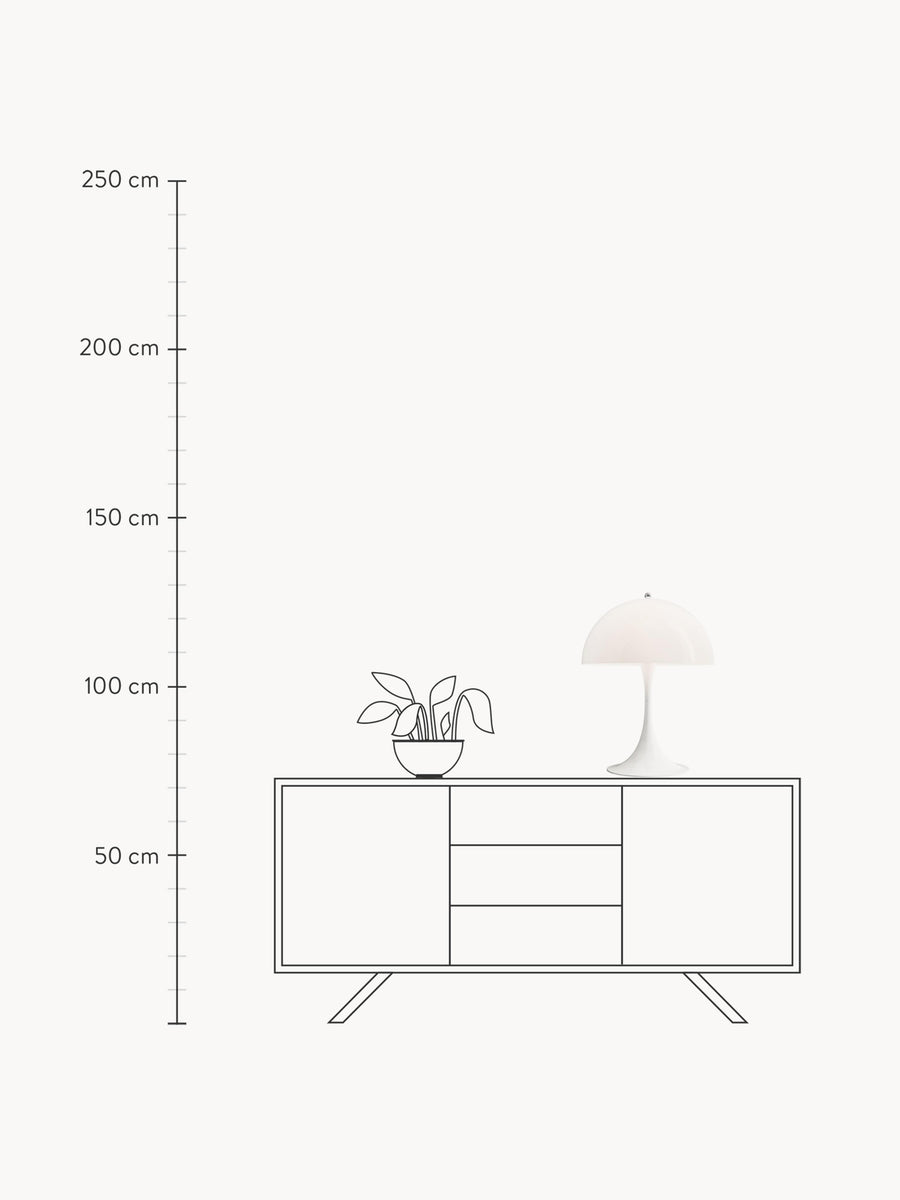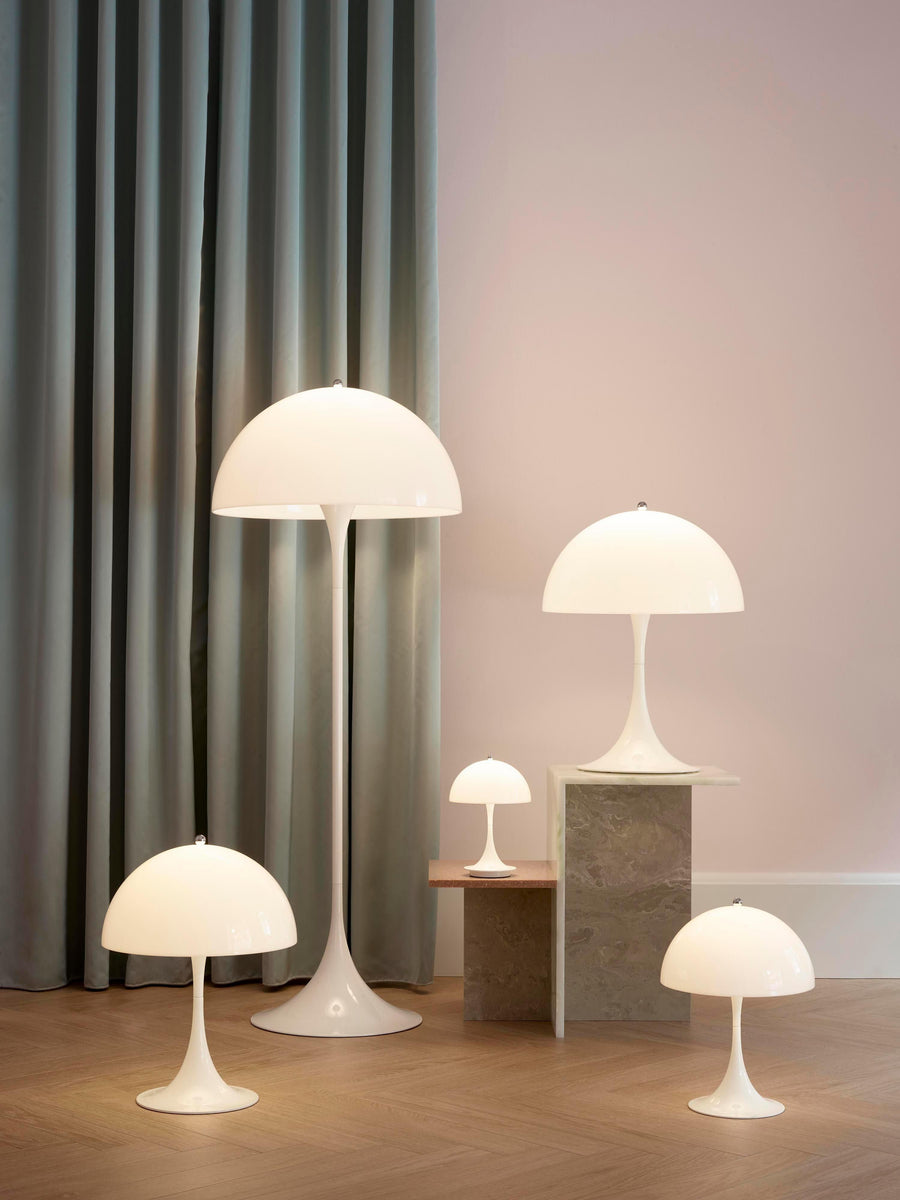 Lampa PANTHELLA została zaprojektowana w 1971 roku przez Vernera Pantona we współpracy z Louis Poulsen. Jej wyjątkowy design odzwierciedla nie tylko zabawny styl Pantona, ale także zapewnia wyjątkowe, przyjemne światło dzięki organicznym kształtom. Półkulisty klosz emituje większość światła skierowanego w dół, gdzie jest odbijane przez podstawę w kształcie trąbki i oświetla otoczenie delikatną, rozproszoną poświatą.