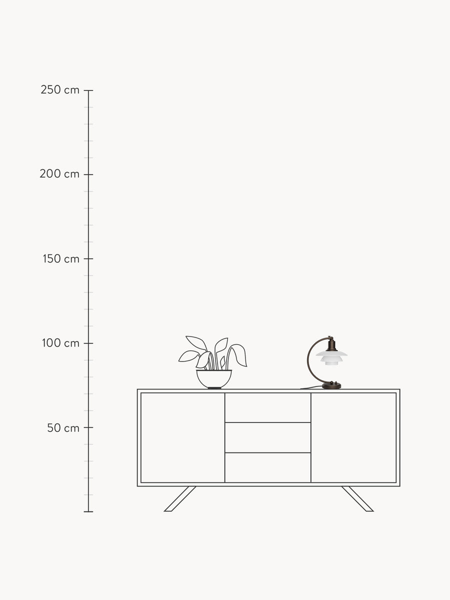 Lampa stołowa PH 2/2 w odcieniu postarzanego mosiądzu z opalowym szkłem jest wyposażona w charakterystyczny dla Poul Henningsena system trzech kloszy. Składa się z trójwarstwowego dmuchanego szkła opalowego z błyszczącą powierzchnią i matowym wnętrzem. Lampa zapewnia idealnie skierowane światło w dół, a także emituje miękką, rozproszoną poświatę dookoła, zapewniając doskonałe oświetlenie.