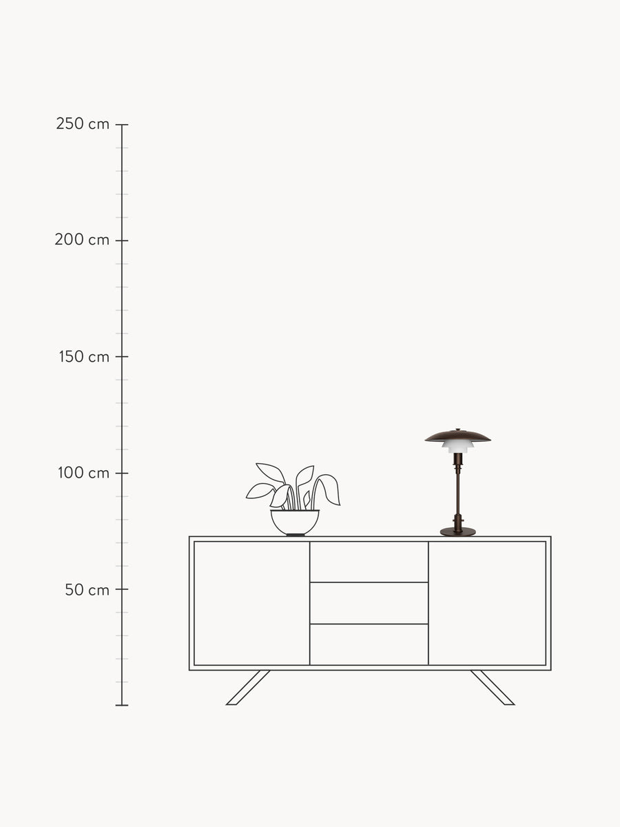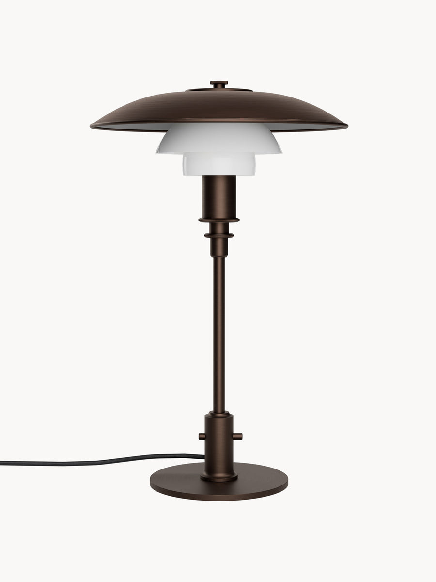 Lampa stołowa PH 3/2 w odcieniu postarzanego mosiądzu z opalowym szkłem jest wyposażona w charakterystyczny dla Poul Henningsena system trzech kloszy. Składa się z trójwarstwowego, ręcznie dmuchanego szkła opalowego z błyszczącym wykończeniem na zewnątrz i matowym, piaskowanym wnętrzem. Lampa zapewnia idealne światło skierowane w dół, a także emituje miękką, rozproszoną poświatę dookoła, zapewniając doskonałe oświetlenie.