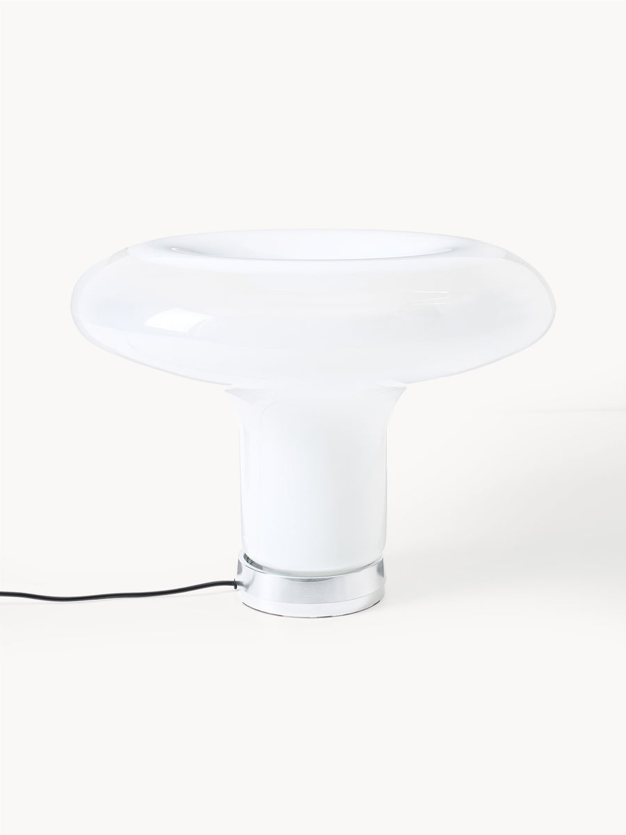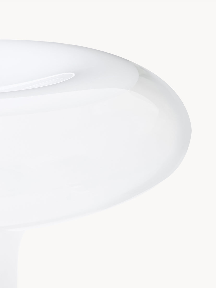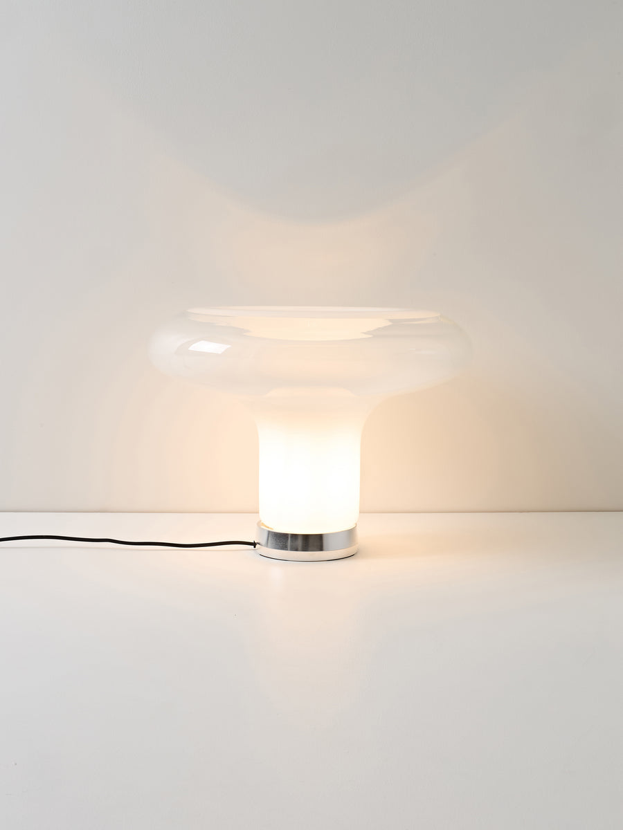 Zaprojektowana w 1967 roku lampa Lesbo jest jednym z symboli designu Made in Italy z lat 70-tych i charakteryzuje się szczególnym kształtem grzybka. Klosz ze szkła dmuchanego tworzy sugestywną interakcję ze światłem. Gradacja przyciemnionej bieli ukrywa żarówkę i kieruje jego promieniowanie w górę, tworząc przyjemną atmosferę świetlną, która podkreśla właściwości szkła.