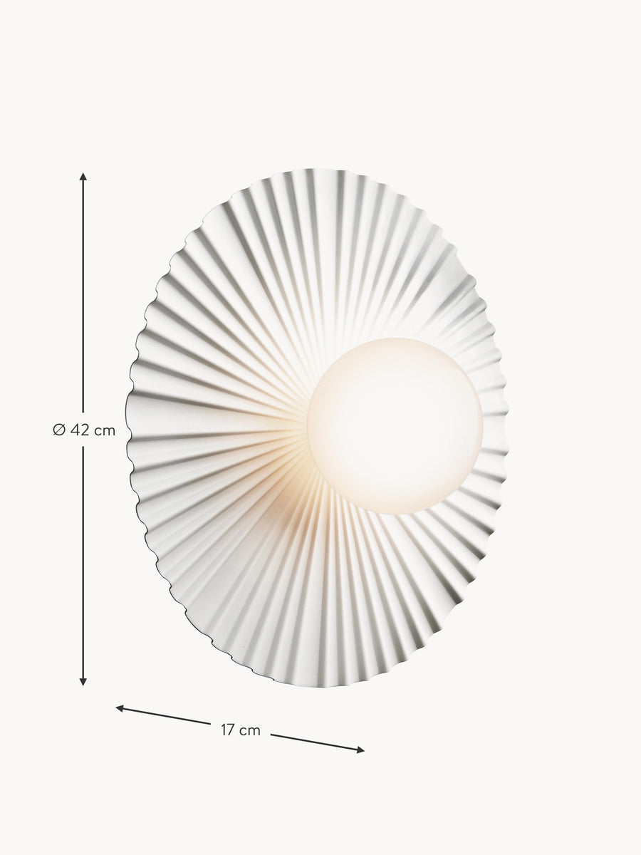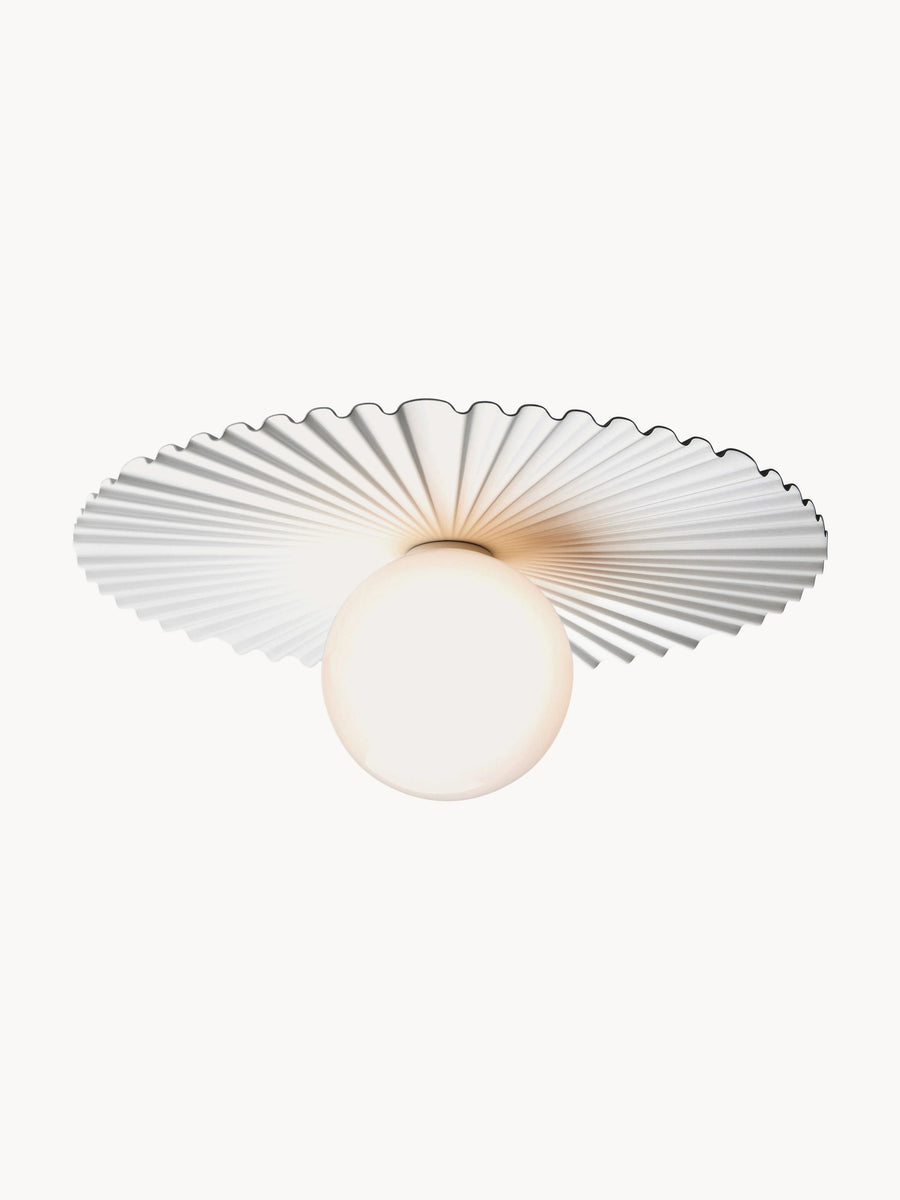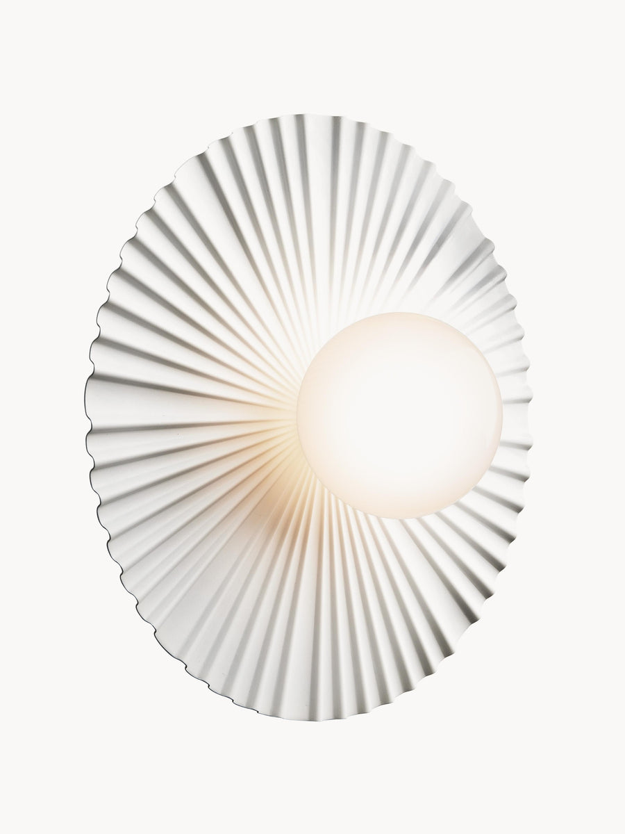 LIILA MUUSE to lampa ścienna/sufitowa o organicznym kształcie i ryflowanej strukturze. Lampa posiada białą tylną płytę i klosz z opalowego szkła. Delikatne krzywizny nadają pomieszczeniu zabawny akcent i przywołują na myśl stiukowe dekoracje na sufitach zabytkowych budynków.
