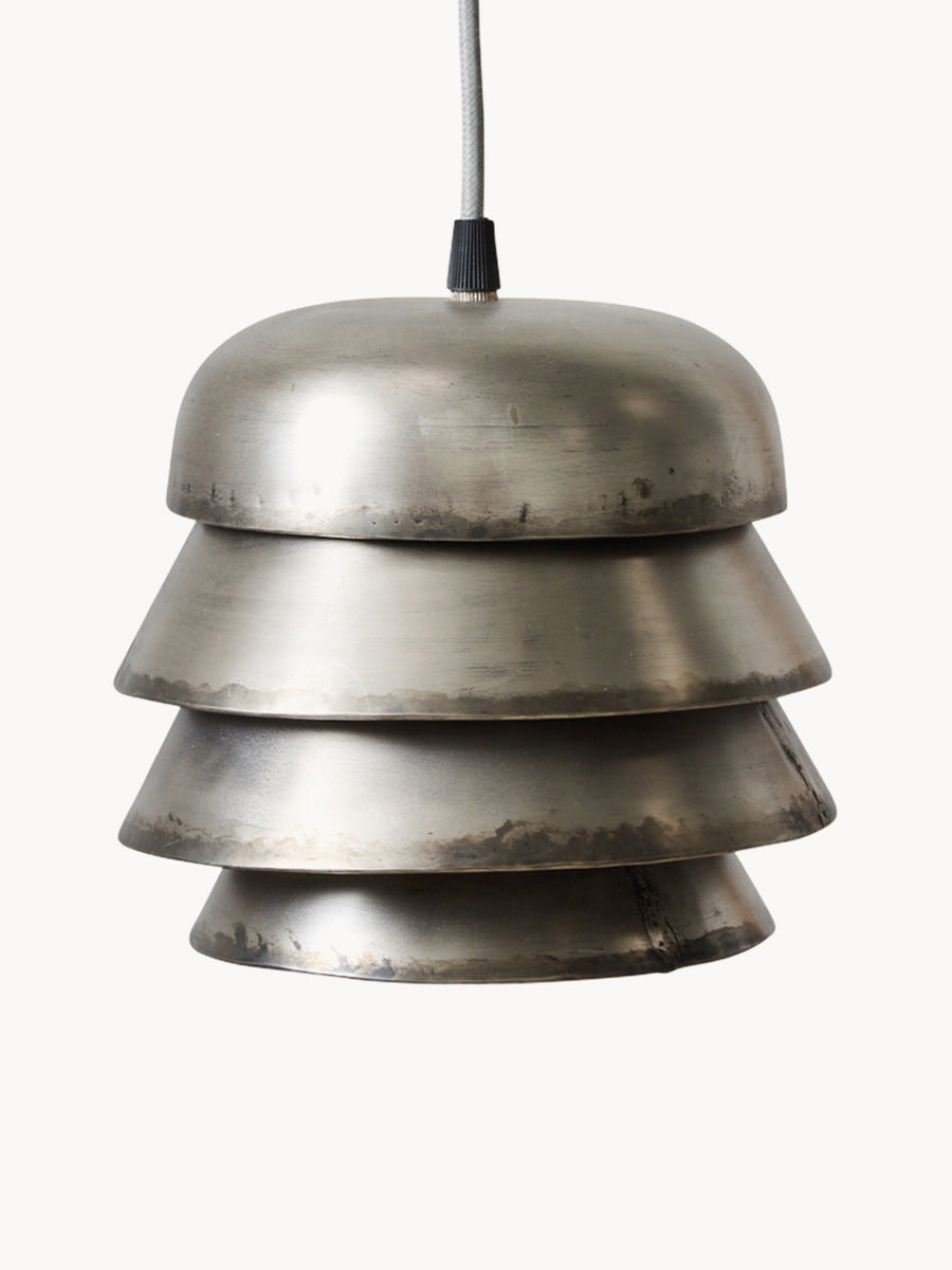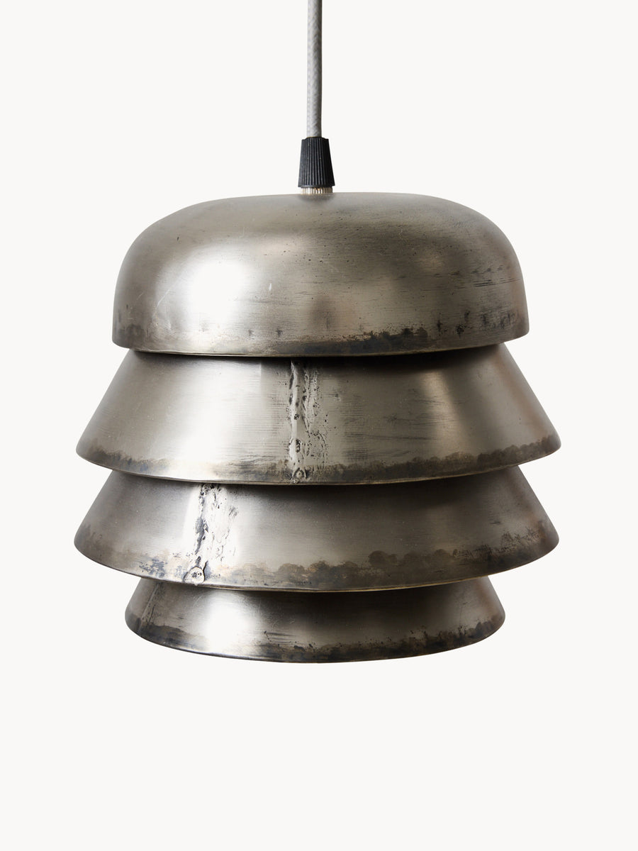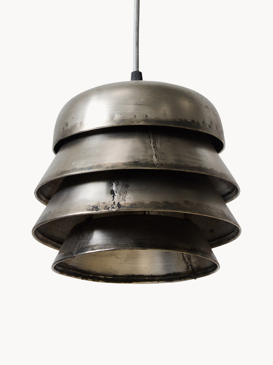 Industrial design z rzeźbiarską głębią. Ta metalowa lampa wisząca ma stożkową, warstwową konstrukcję, która tworzy silną grę światła i cienia. Surowe, szczotkowane wykończenie dodaje faktury i charakteru – idealnie sprawdzi się nad stołem w jadalni, wyspą kuchenną lub w każdym innym miejscu, w którym potrzebne jest odważne, architektoniczne oświetlenie.