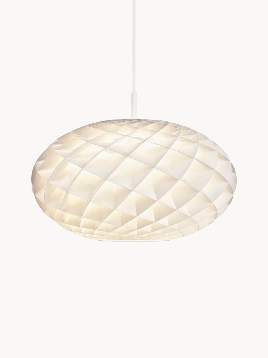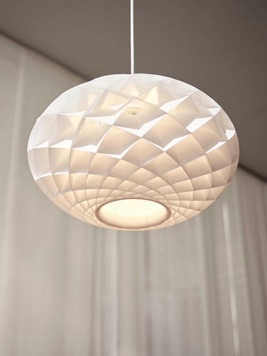 Eliptyczna lampa wisząca wzorowana jest na oryginalnej Paterze Øivinda Slaatto z 2015 roku. Ten projekt oparty na ciągu Fibonacciego stanowi nowoczesną interpretację klasycznego żyrandola. Konstrukcja lampy zapewnia, że światło nie razi pod kątem świecenia 45 stopni. Lampa emituje światło skierowane w dół i w górę, przez co oświetla sufit i tym samym wprowadza przyjemną atmosferę. Tworzy to delikatne przejścia między światłem bezpośrednim i odbitym, co szczególnie podkreśla niezwykły blask kulistej lampy.