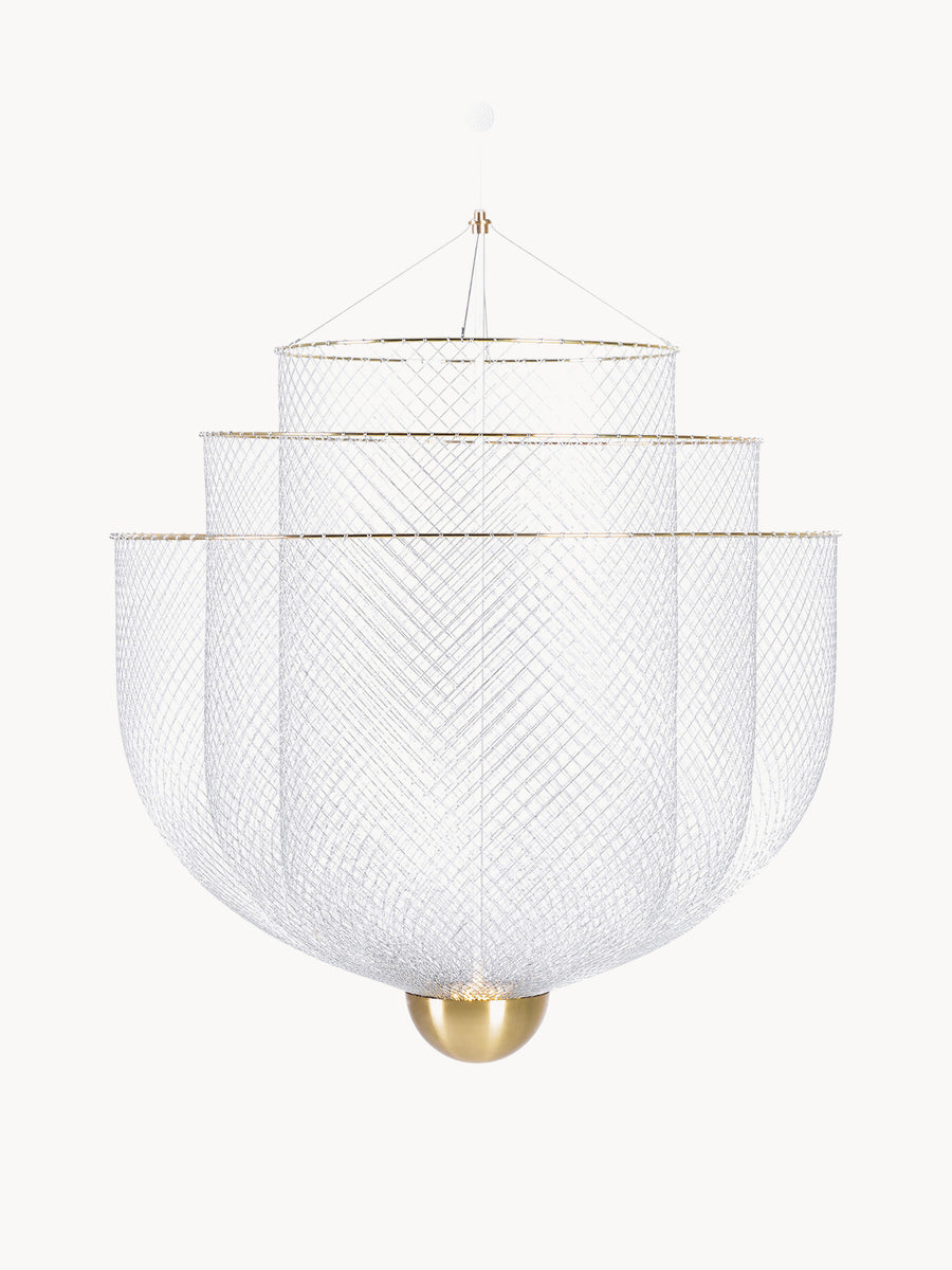 Każdy, kto spojrzy na żyrandol MESHMATICS, nigdy nie zgadnie, co kryje się za jego wyrafinowanym wyglądem. Rick Tegelaar wyniósł charakter skromnej siatki drucianej, opracowując maszynę i zestaw narzędzi do precyzyjnego formowania. Pełny potencjał tego cienkiego i elastycznego materiału jest rozciągnięty i ujęty w trzech warstwach piękna.