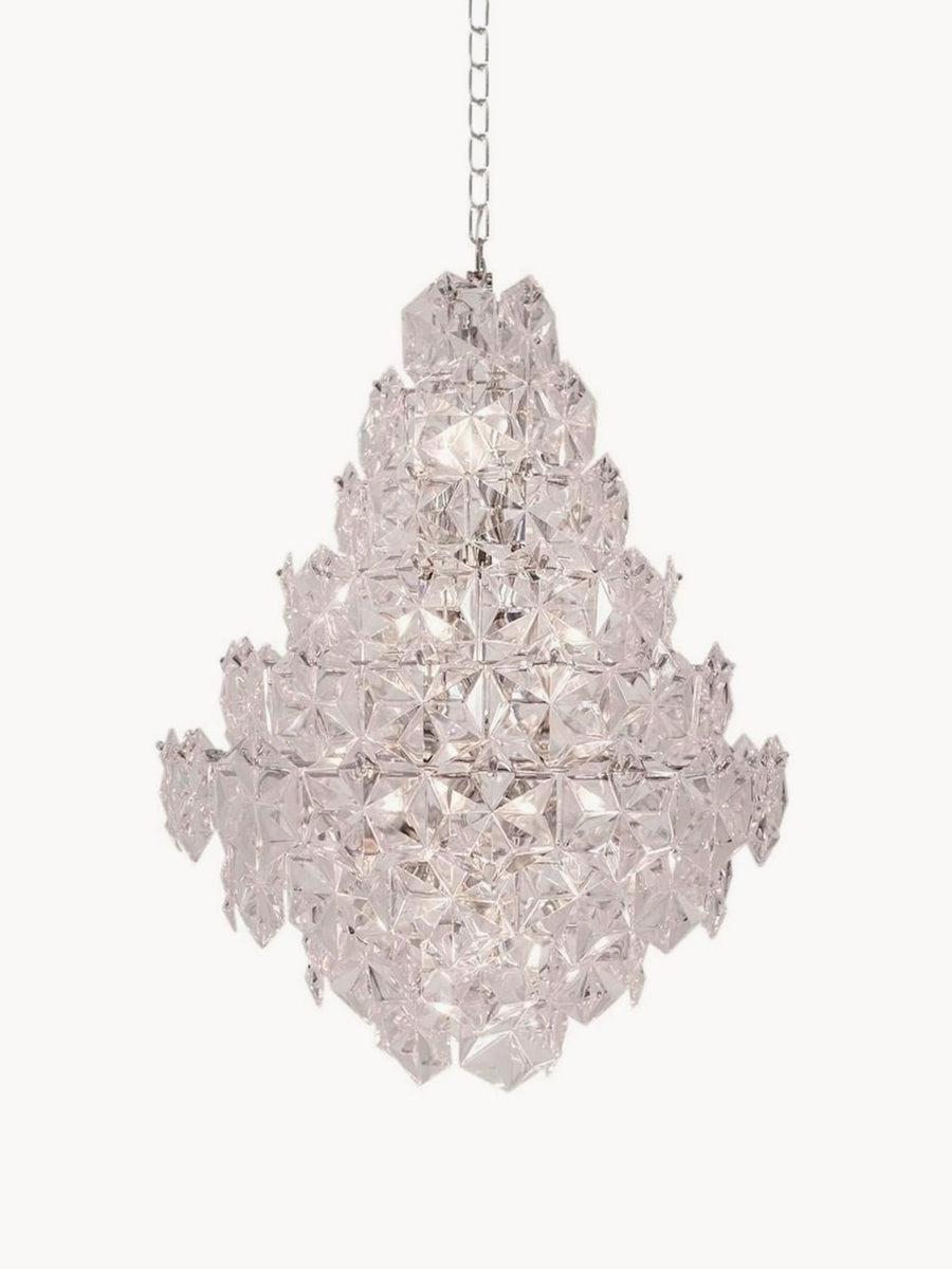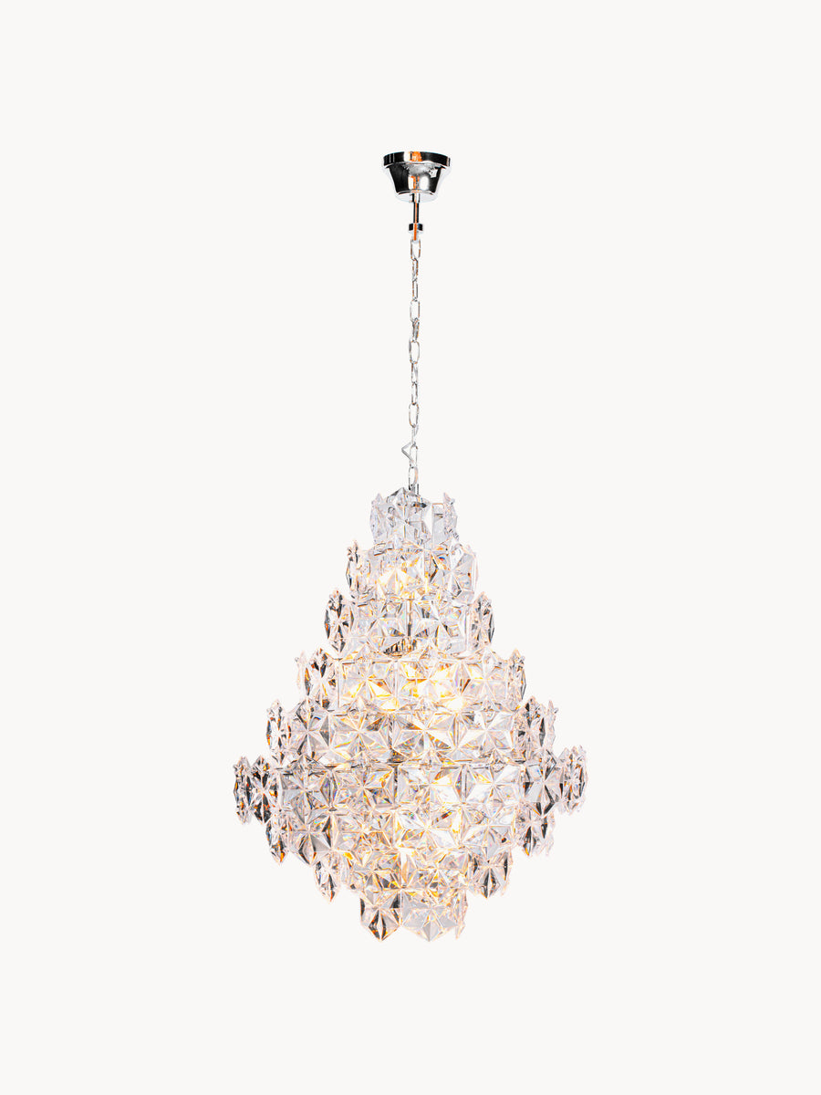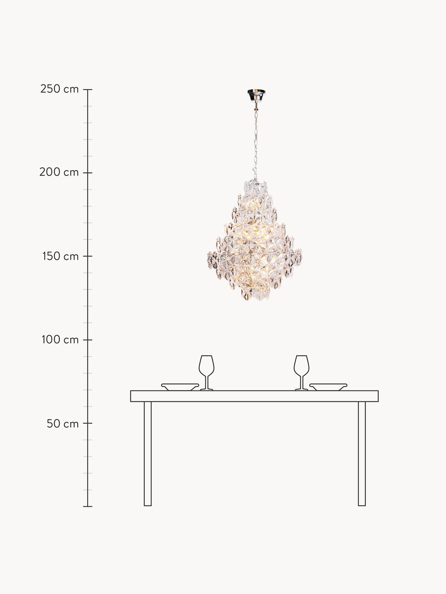 Lampa wisząca MONARQUE Grande robi wrażenie w każdym pomieszczeniu. Składa się z przezroczystych akrylowych pryzmatów, które nadają pomieszczeniu wyjątkowego blasku, przez co przypomina żyrandol.