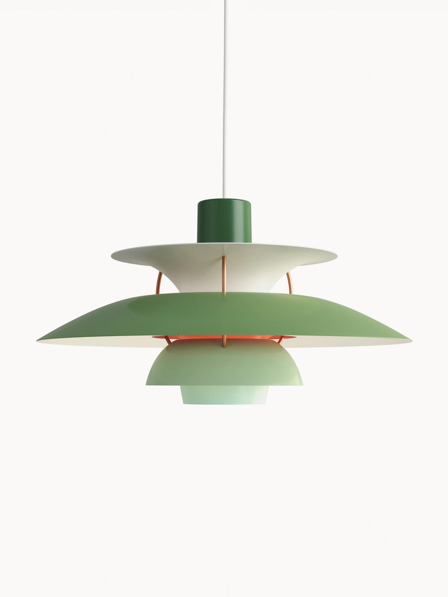 Lampa wisząca emituje nieoślepiające światło skierowane w dół. Jednocześnie oświetla własną ramę, tworząc od środka delikatną, przyjemną poświatę. PH 5 została zaprojektowana przez Poula Henningsena w 1958 roku w odpowiedzi na liczne zmiany w kształcie i rozmiarze żarówek.