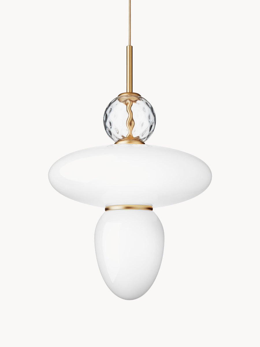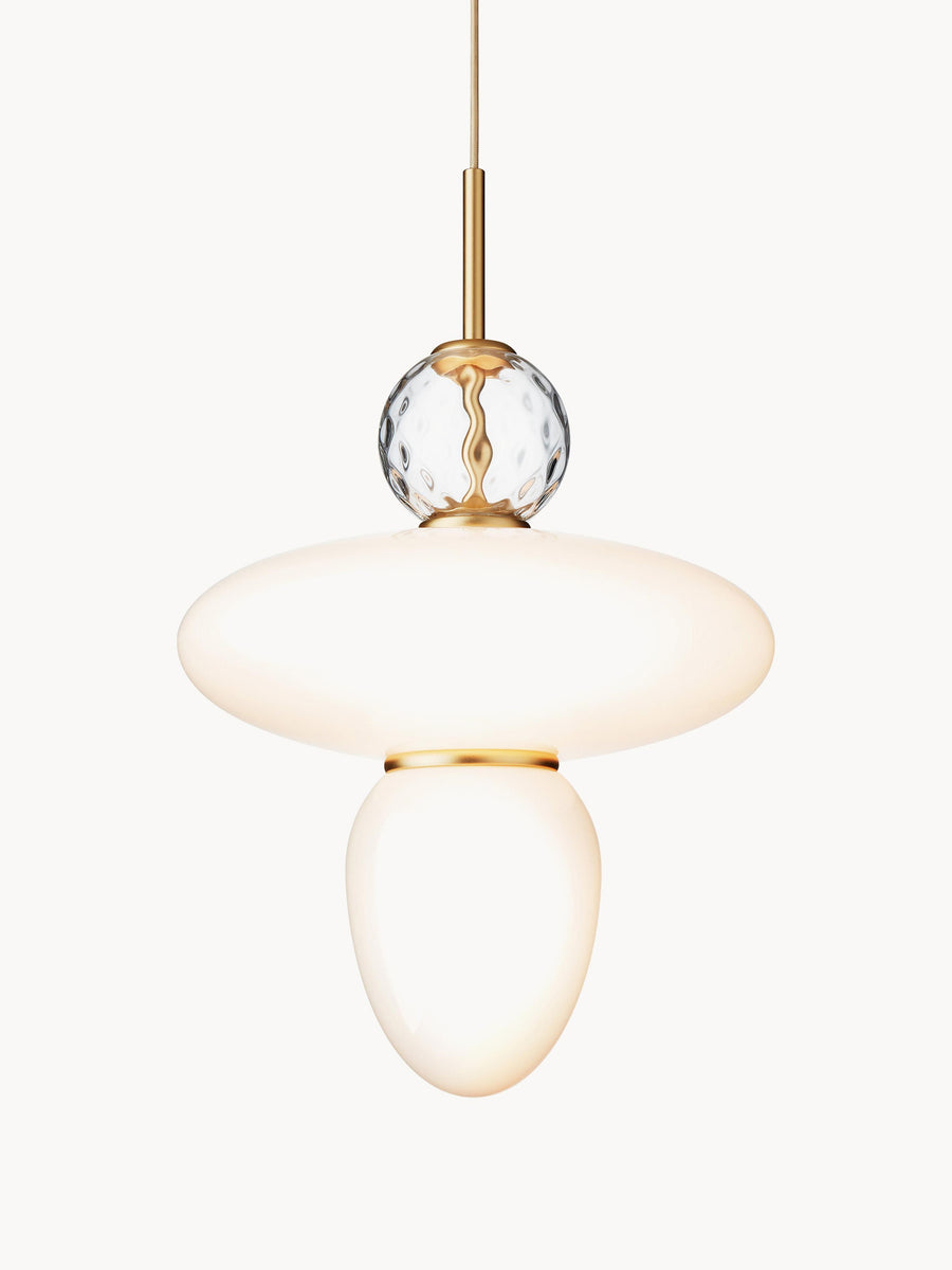 Ozdobna i geometryczna lampa wisząca RIZZATTO zaprojektowana przez światowej sławy projektanta, Paolo Rizzatto, wyróżnia się eliptycznym kloszem ze szkła, do którego przymocowano element w kształcie kropli. Transparentny, wzorzysty szklany ornament oraz satynowe wykończenia to wyjątkowo ozdobne detale. Klosz wykonano z opalowego, białego szkła, które zapewnia miękkie i równomierne oświetlenie wnętrza.