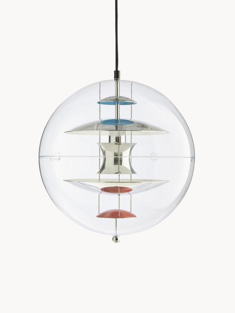 Dekoracyjna lampa wisząca VP Globe to kryształowo transparentna zewnętrzna kula wykonana z akrylu z pięcioma wewnętrznymi reflektorami zawieszonymi na trzech stalowych łańcuszkach. Czerwone i niebieskie akcenty dopełniają futurystyczny rzeźbiarski design i podkreślają niepowtarzalny styl Panton. Panton chciał zaprojektować lampę, która przyciąga wzrok i jednoczy pomieszczenie, niezależnie od tego, czy wisiała samodzielnie, czy w grupie. Dzięki temu lampa wisząca jest idealnym wyborem w korytarzu lub długim korytarzu, czy też jako element rzeźbiarski w rogu pomieszczenia.