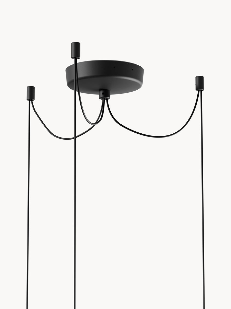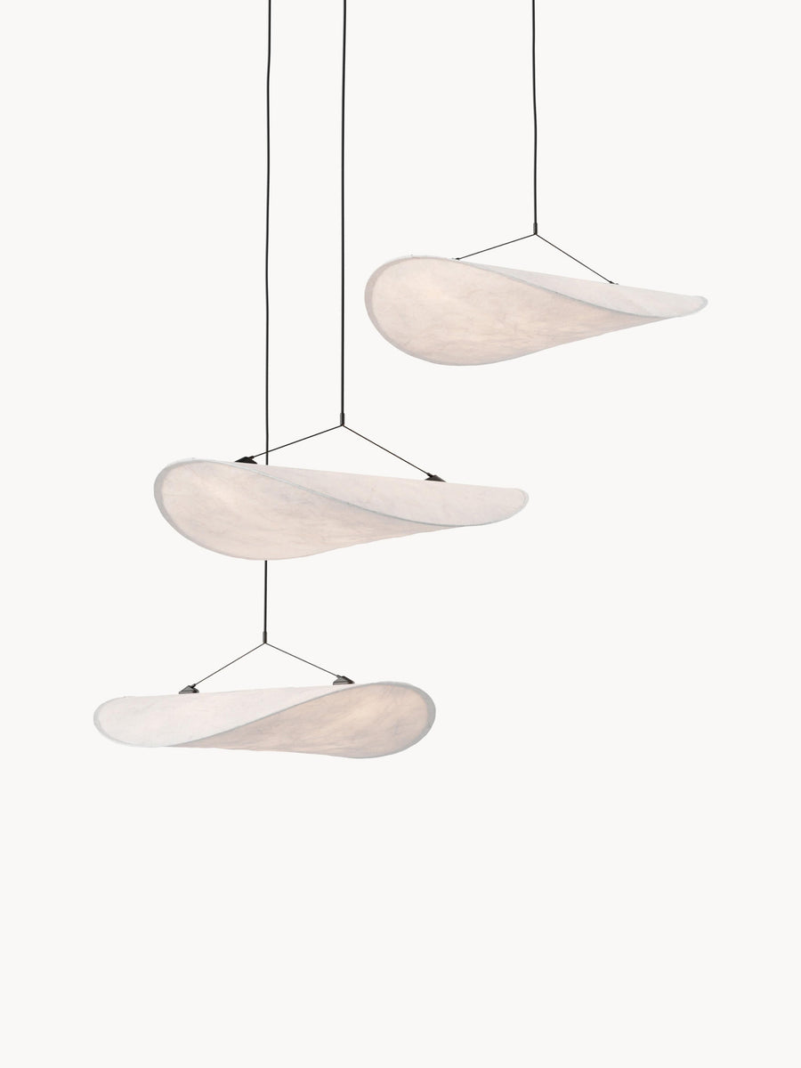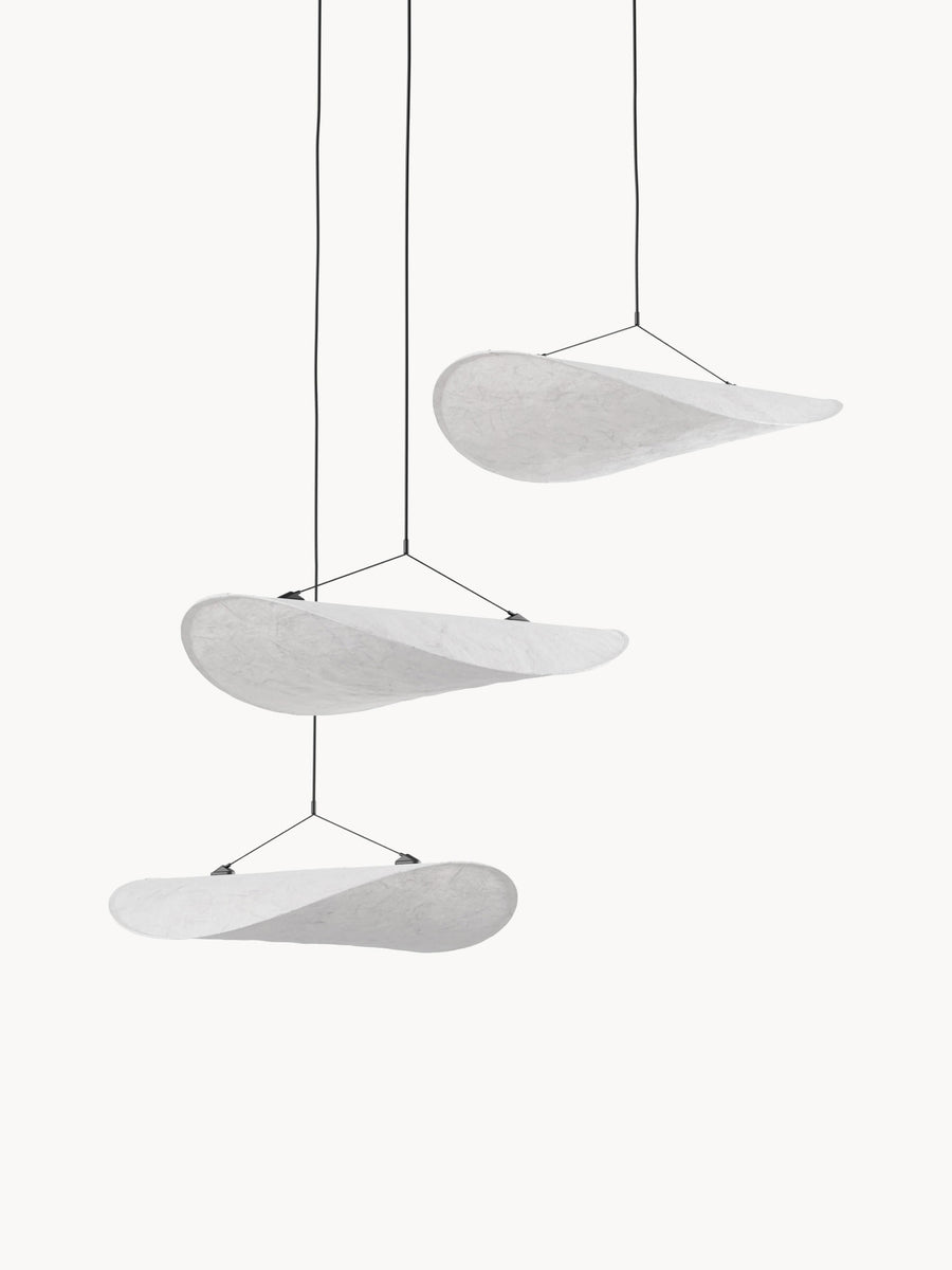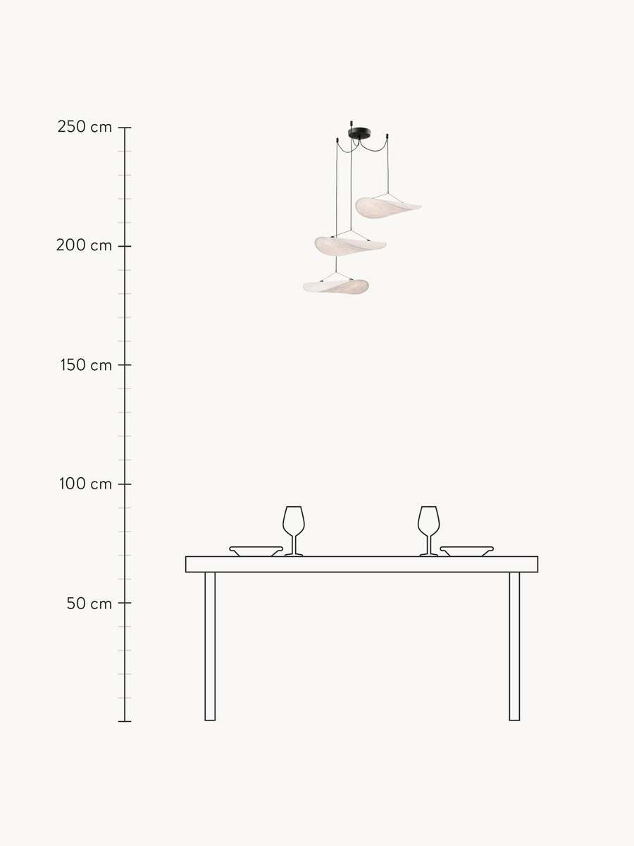 Żyrandol TENSE, składający się z trzech mniejszych kloszy, stanowi wyrafinowaną alternatywę dla klasycznej wersji. Trzy klosze tworzą harmonijną konstelację, dając wrażenie objętości, a jednocześnie lekkości. Zgodnie z charakterem serii TENSE, klosze wykonane są z Tyvek, zapewniając delikatne rozproszenie światła zarówno w górę, jak i w dół.