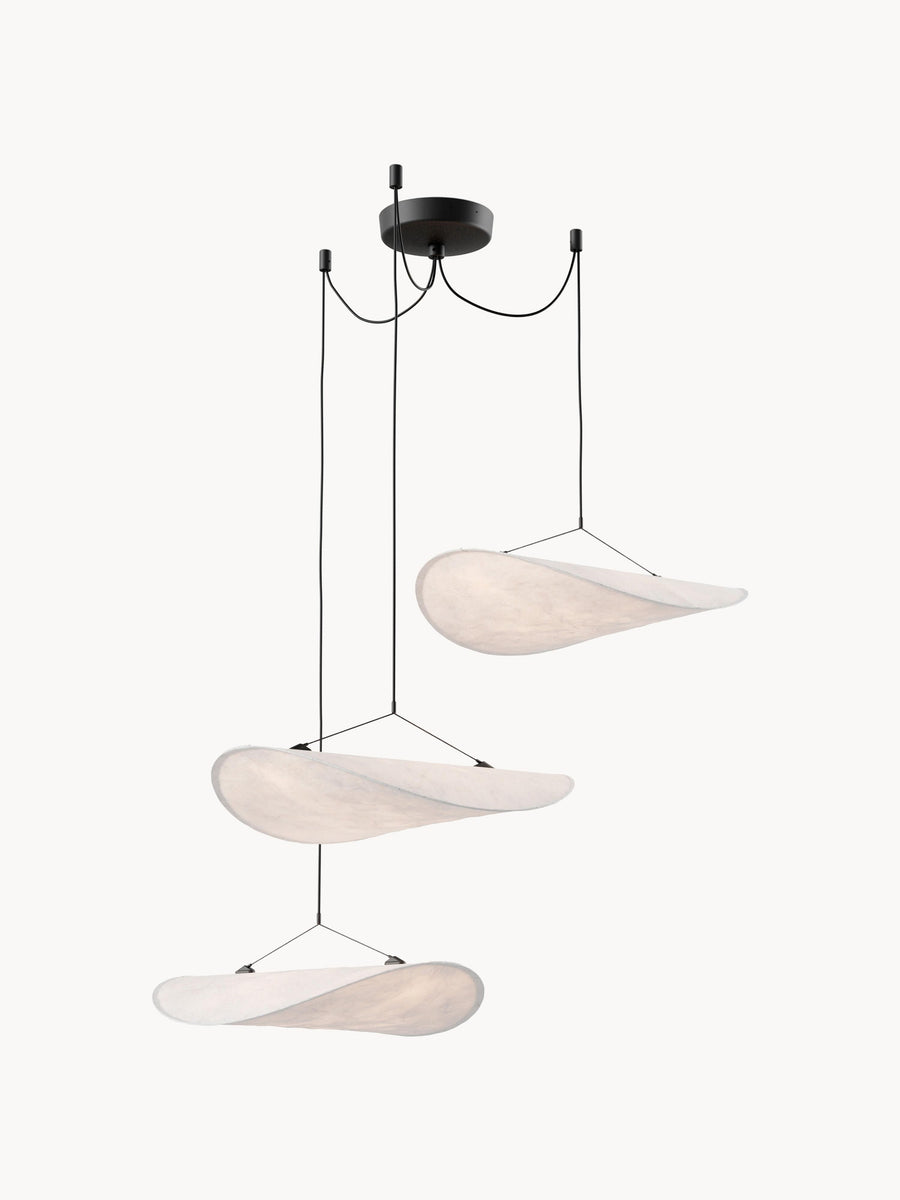Dzięki połączeniu trzech kloszy, żyrandol TENSE stanowi wyrafinowaną alternatywę dla klasycznych modeli. Trzy klosze tworzą harmonijną konstelację, która sprawia wrażenie objętości, a jednocześnie jest lekka. Zgodnie z serią TENSE, klosze wykonane są z Tyveku, który delikatnie rozprasza światło w górę i w dół.