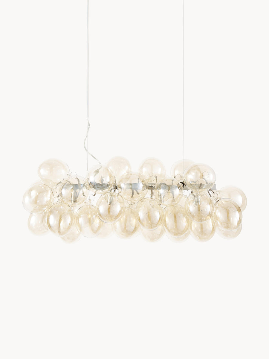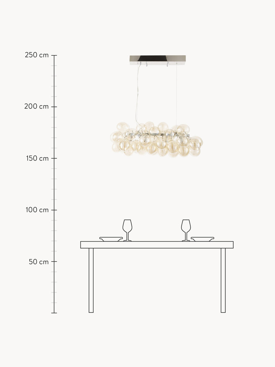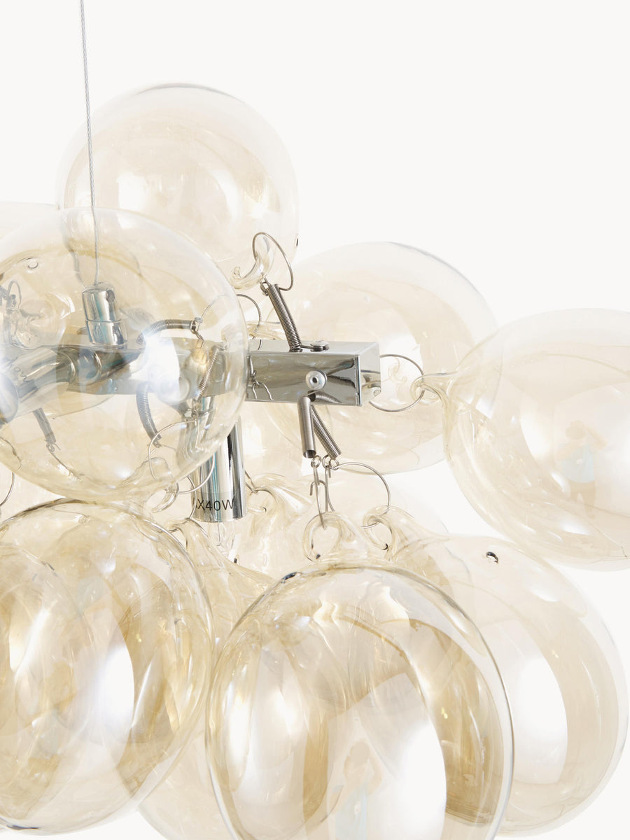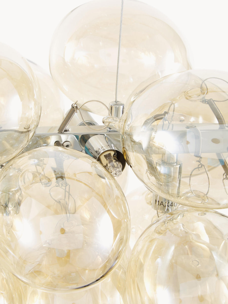 GROSS z metalowym zawieszeniem i szklanymi kloszami to piękna, ekskluzywna lampa wisząca składająca się z 38 delikatnych szklanych klastrów. Lampa dobrze prezentuje się w wielu miejscach i może być zawieszona nad stołem w jadalni, w salonie, a nawet nad stołem konferencyjnym. Możliwość ściemniania za pomocą ściemnialnego źródła światła i zewnętrznego ściemniacza. Lampa wisząca ma regulowaną wysokość.