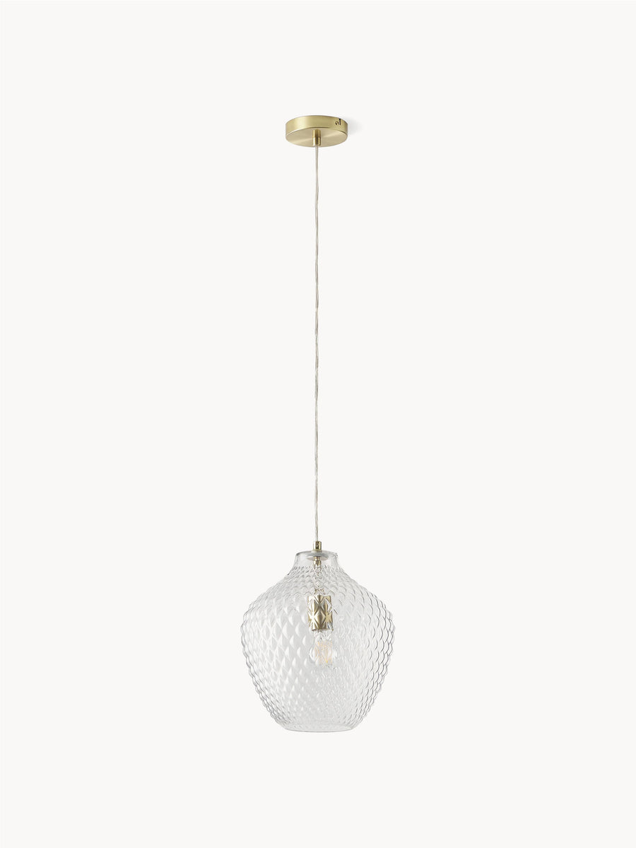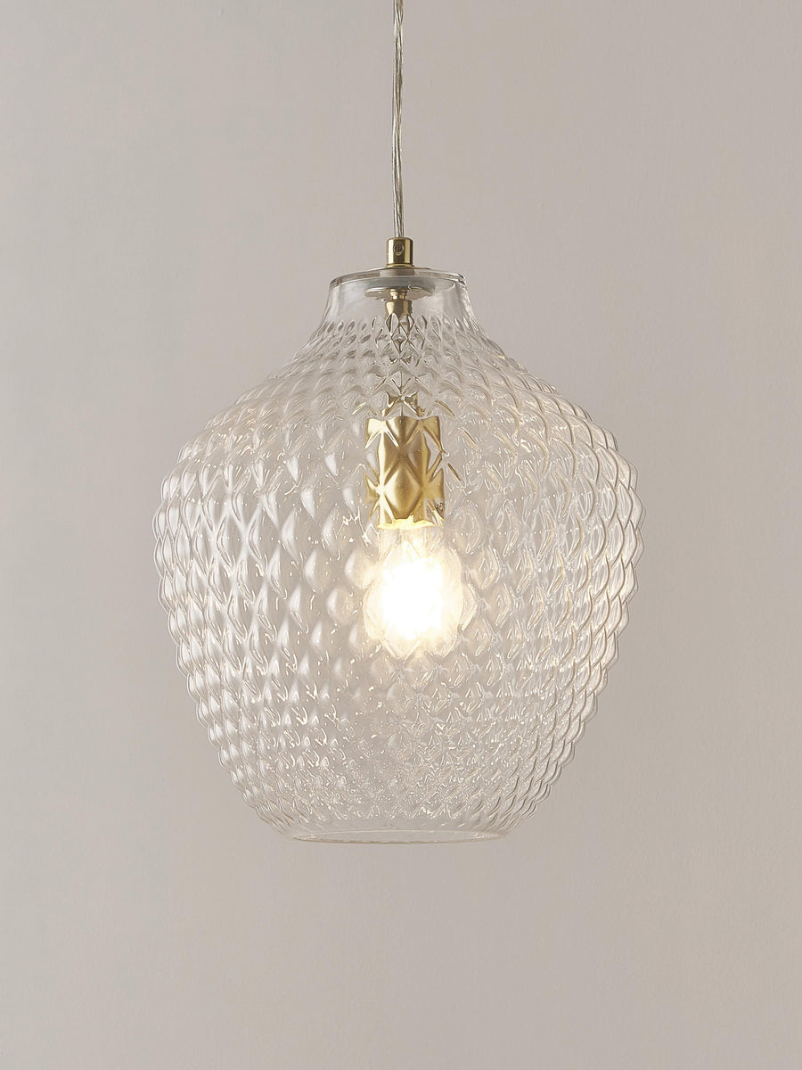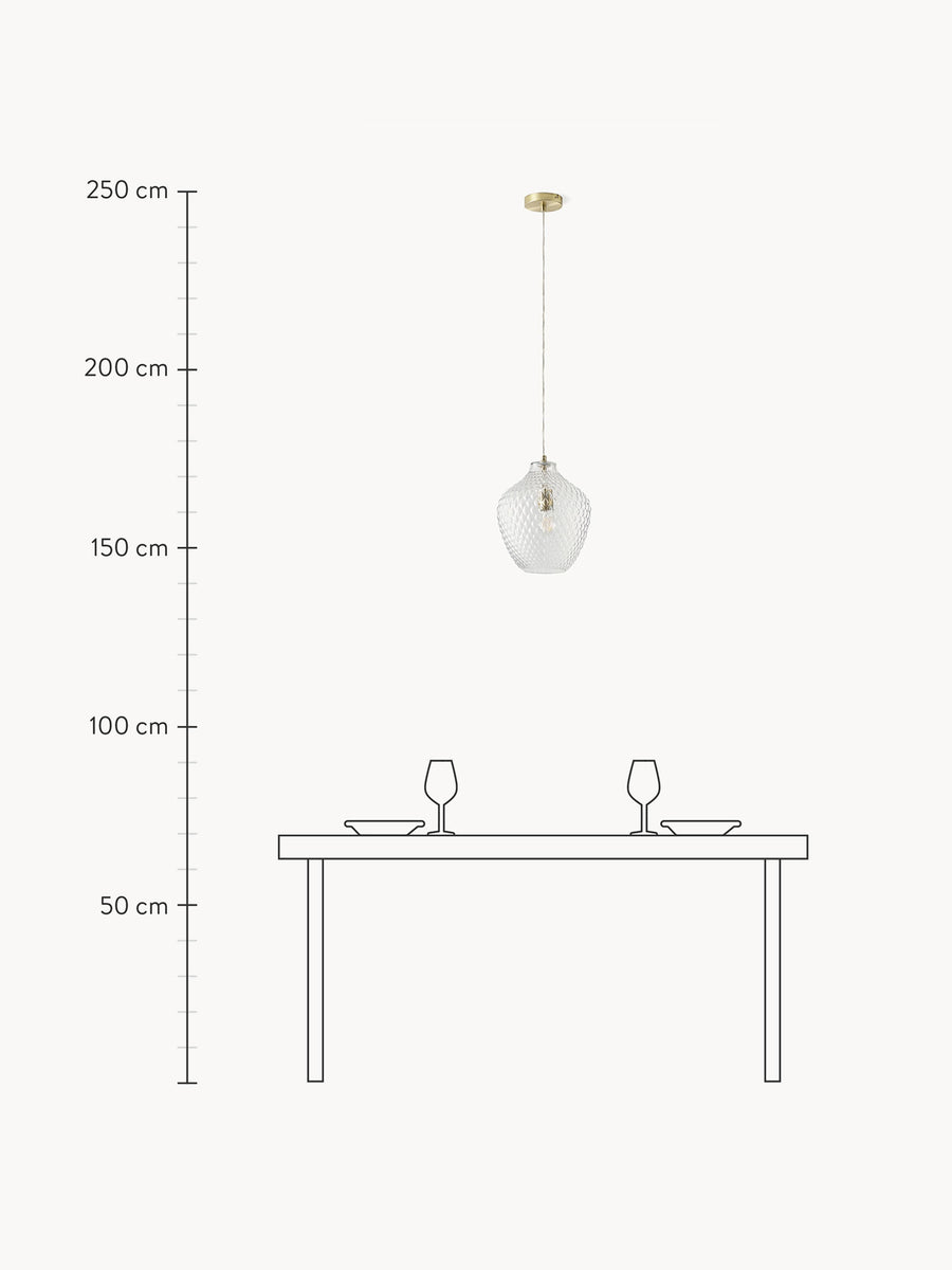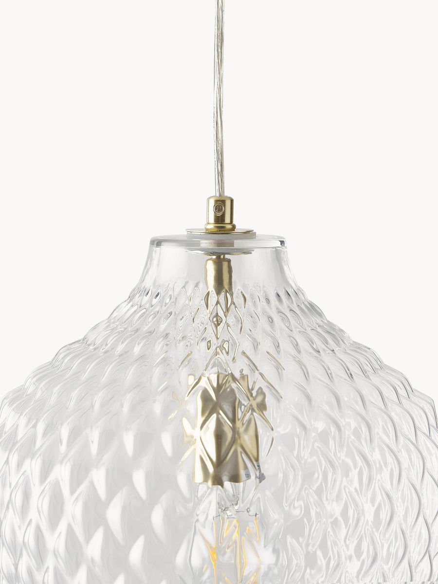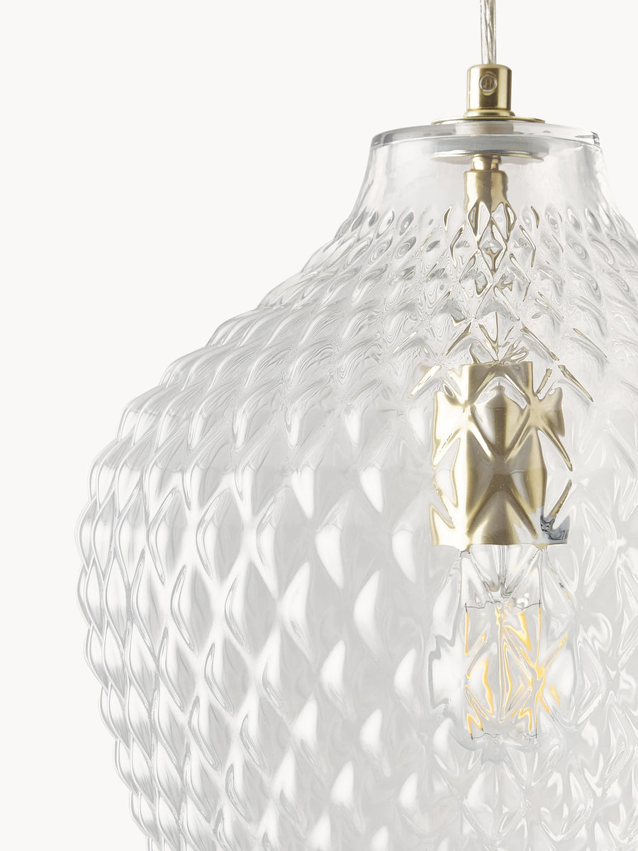 Artystyczny design ze szkła – lampa wisząca LEE dzięki swojej powierzchni z reliefem wyczaruje piękny wzór na ścianie w salonie lub jadalni, tworząc w ten sposób wyjątkowy nastrój w Twoim domu.
