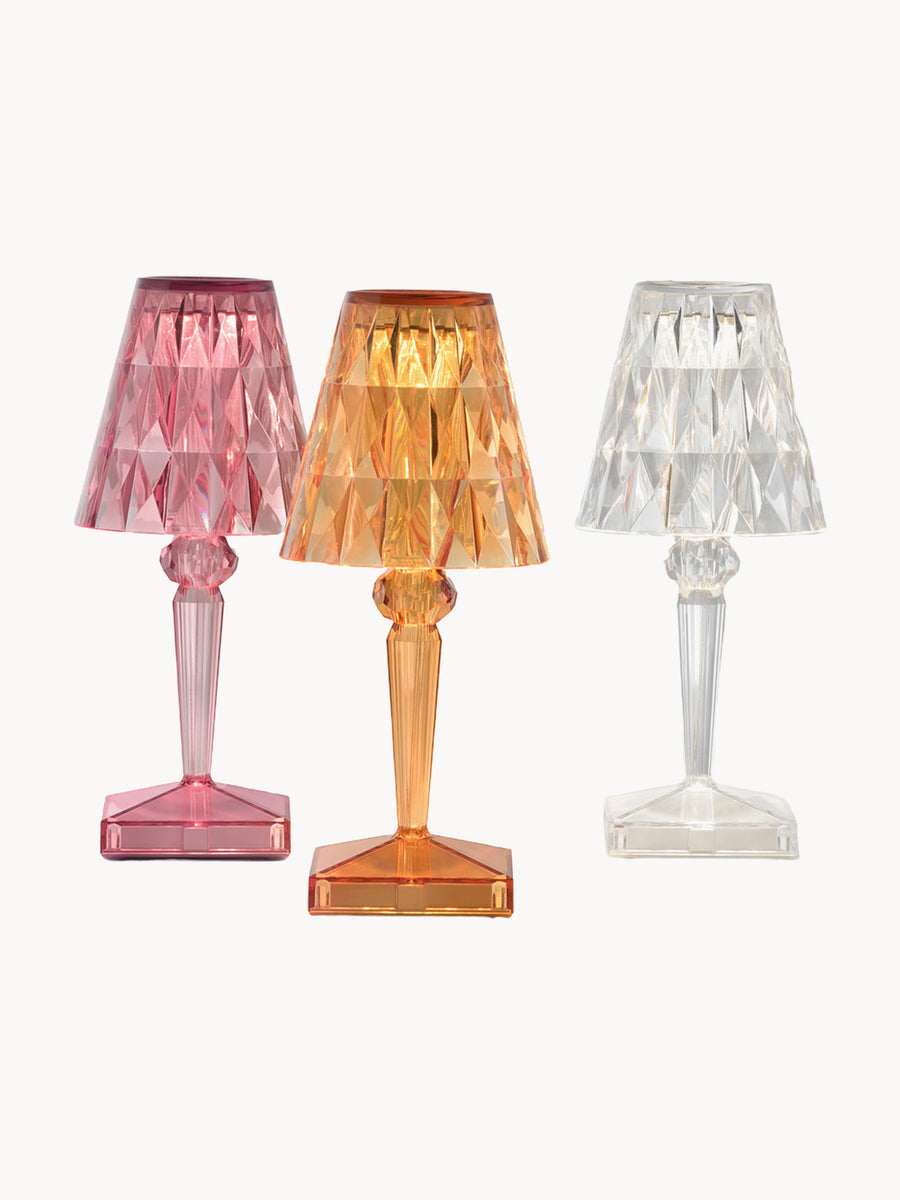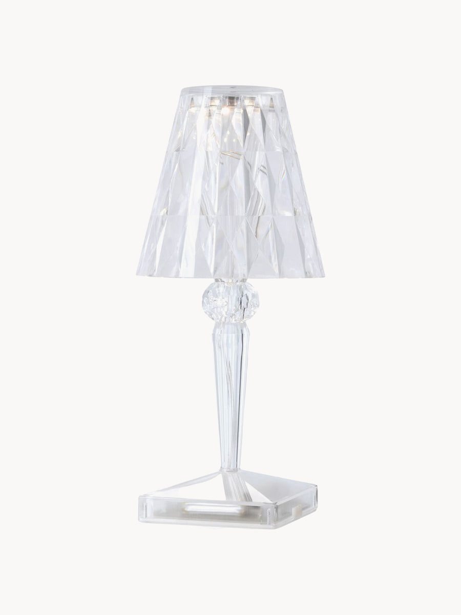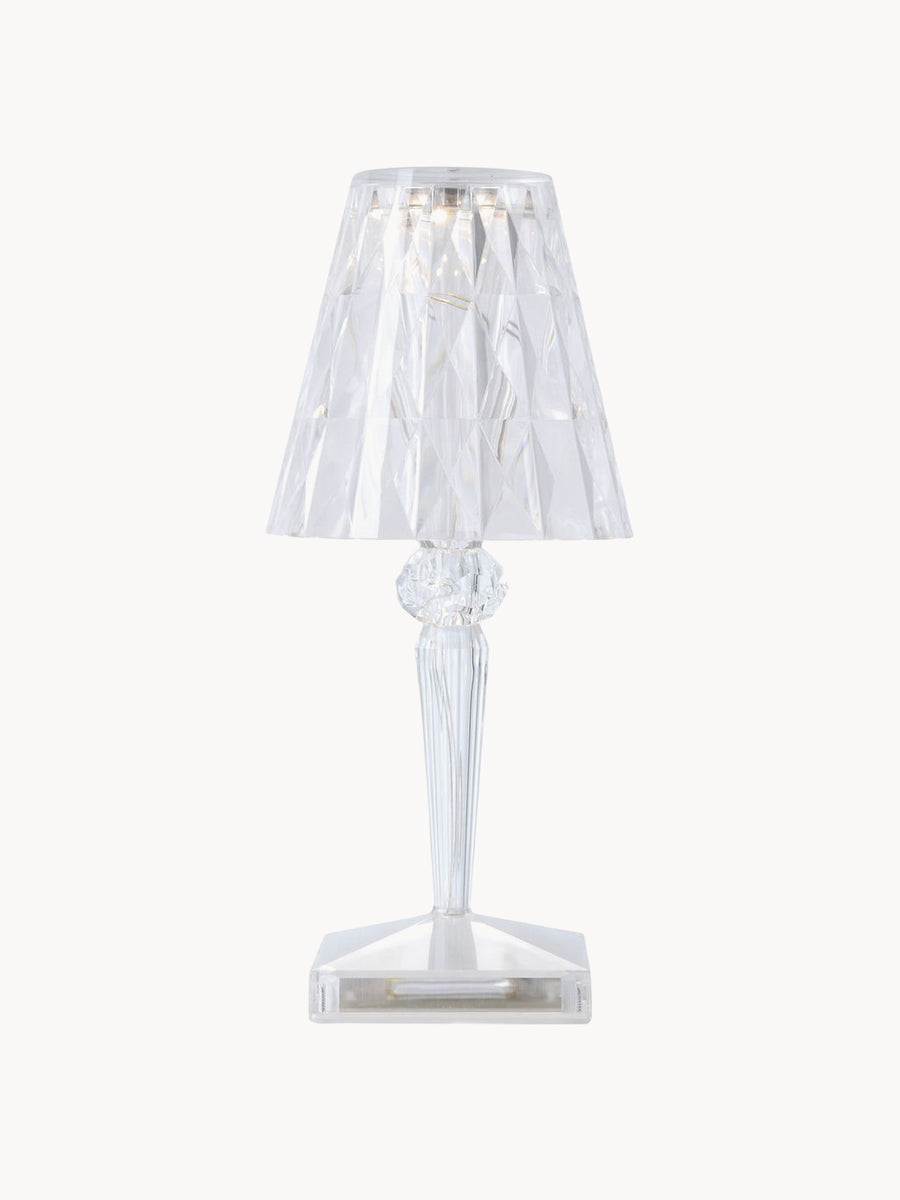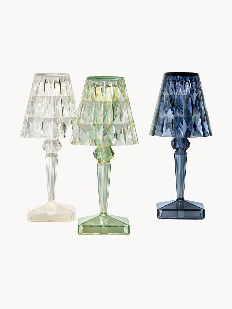 Lampa stołowa BATTERY od projektanta Ferruccio Lavianiego zachwyca wyjątkowymi refleksami światła, które zmieniają się w zależności od kąta patrzenia na fasetowany klosz i tworzą zaskakującą grę świateł.