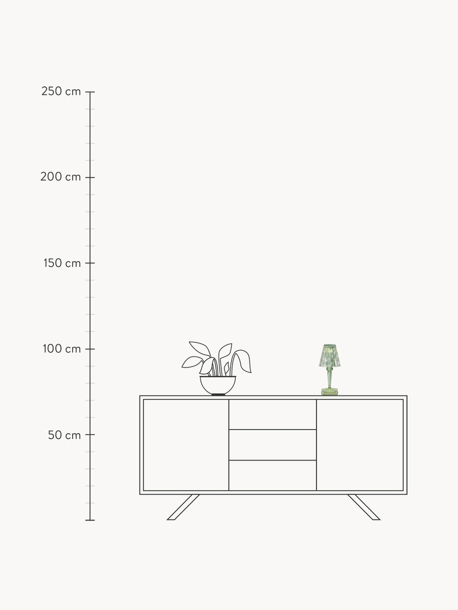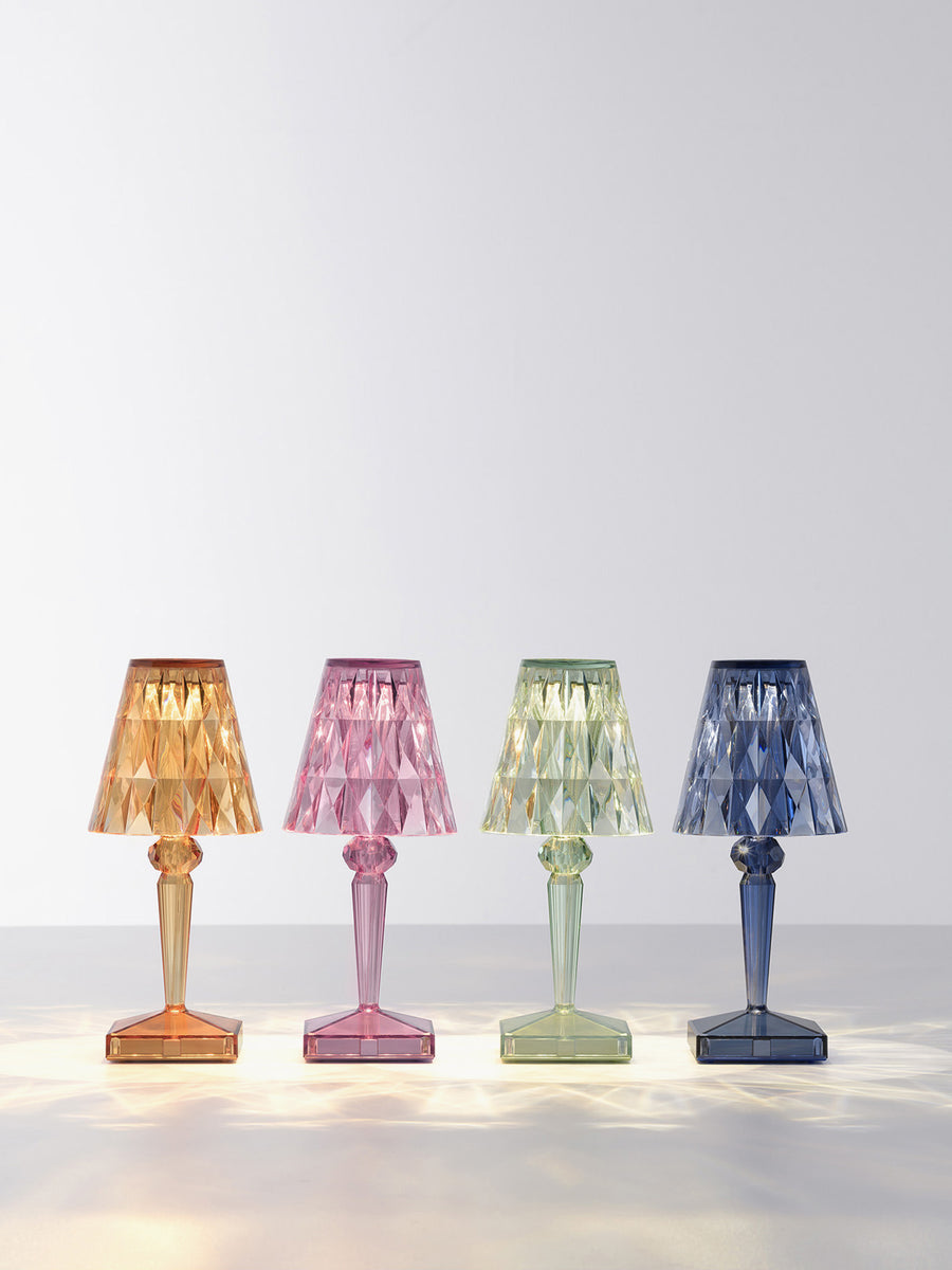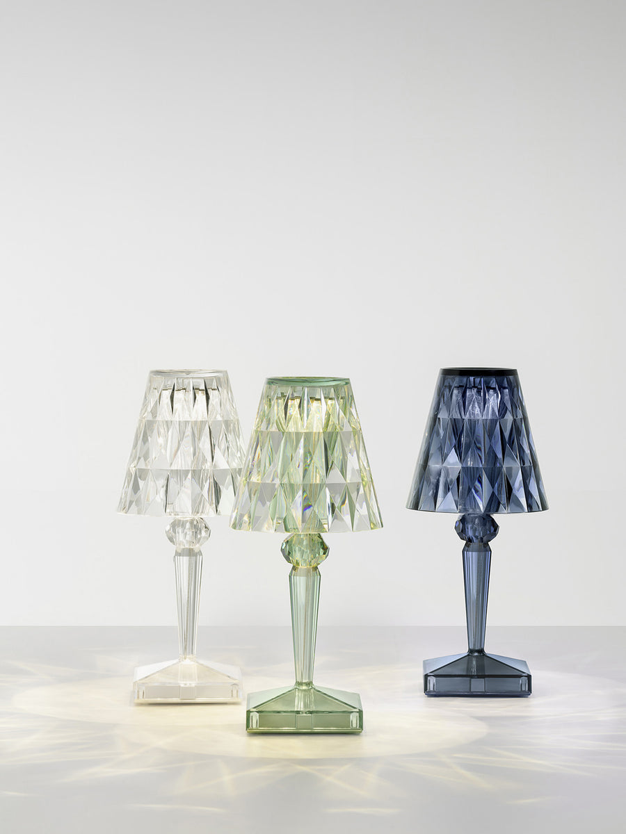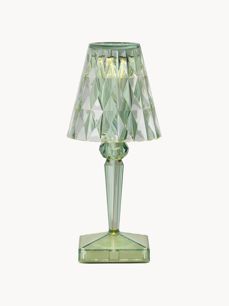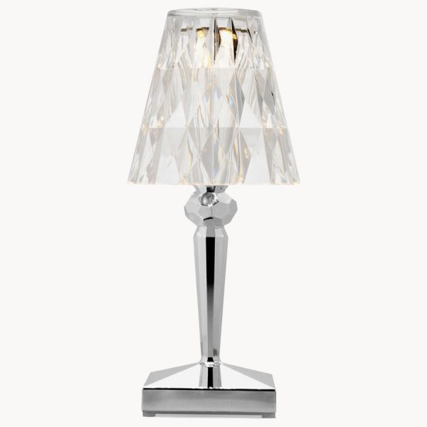 Lampa stołowa BATTERY od projektanta Ferruccio Lavianiego zachwyca wyjątkowymi refleksami światła, które zmieniają się w zależności od kąta patrzenia na fasetowany klosz i tworzą zaskakującą grę świateł.