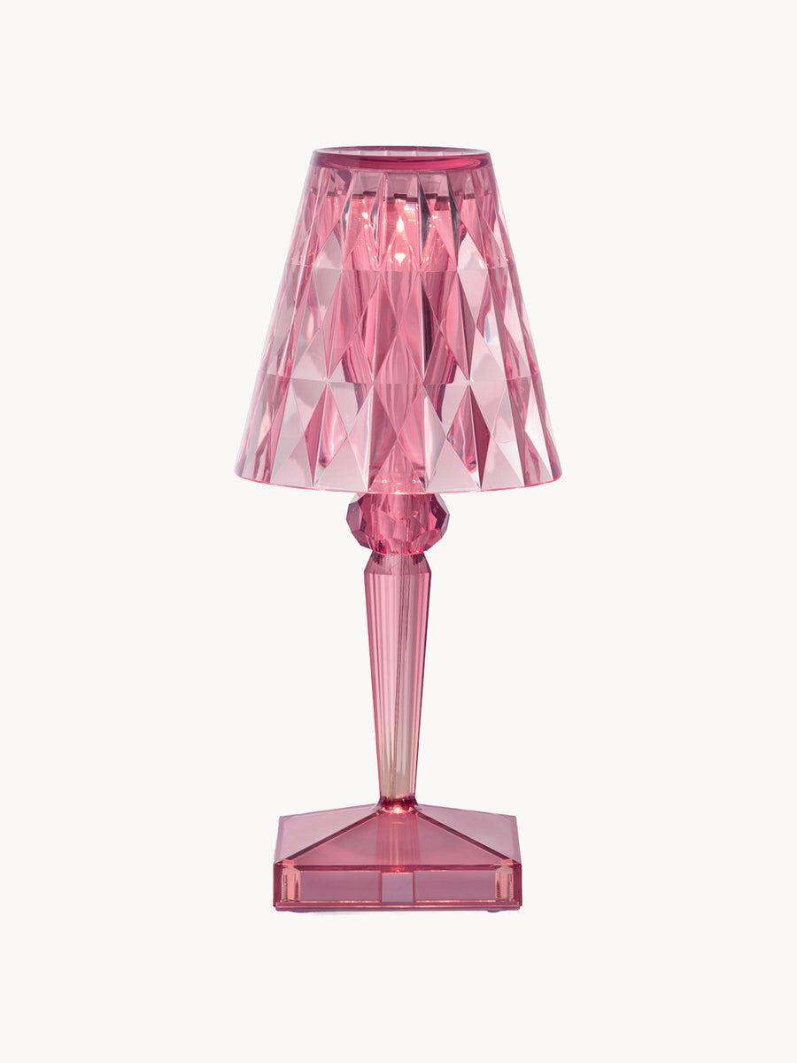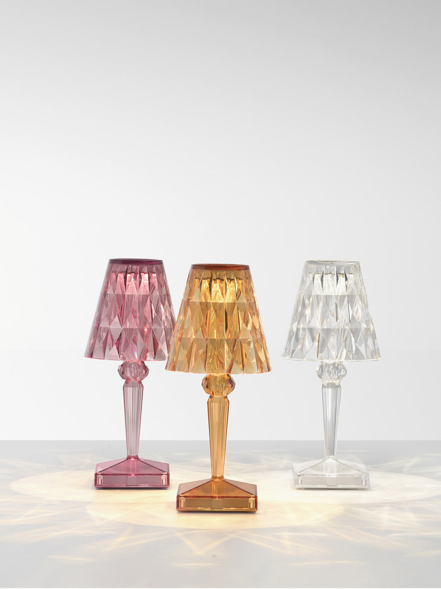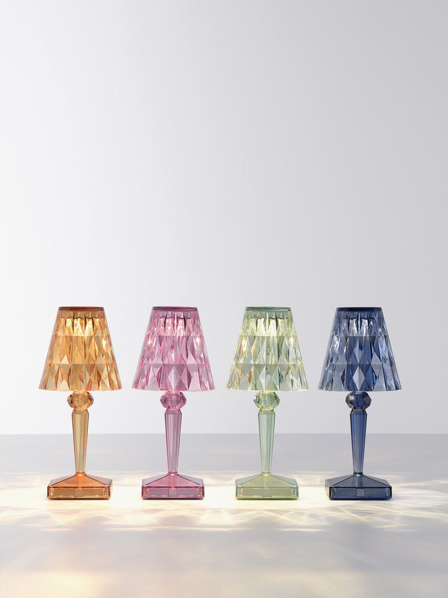 Lampa stołowa BATTERY od projektanta Ferruccio Lavianiego zachwyca wyjątkowymi refleksami światła, które zmieniają się w zależności od kąta patrzenia na fasetowany klosz i tworzą zaskakującą grę świateł.