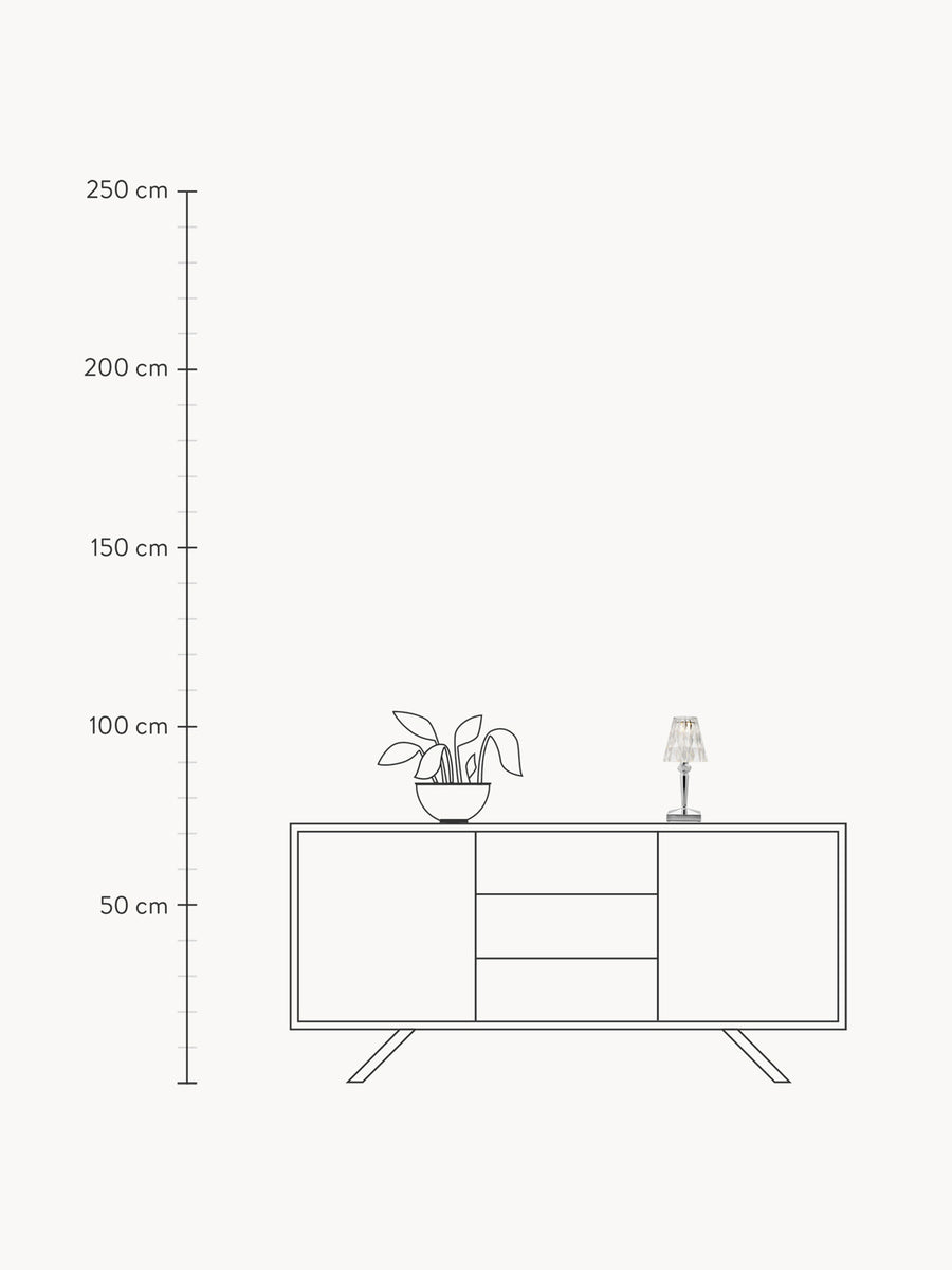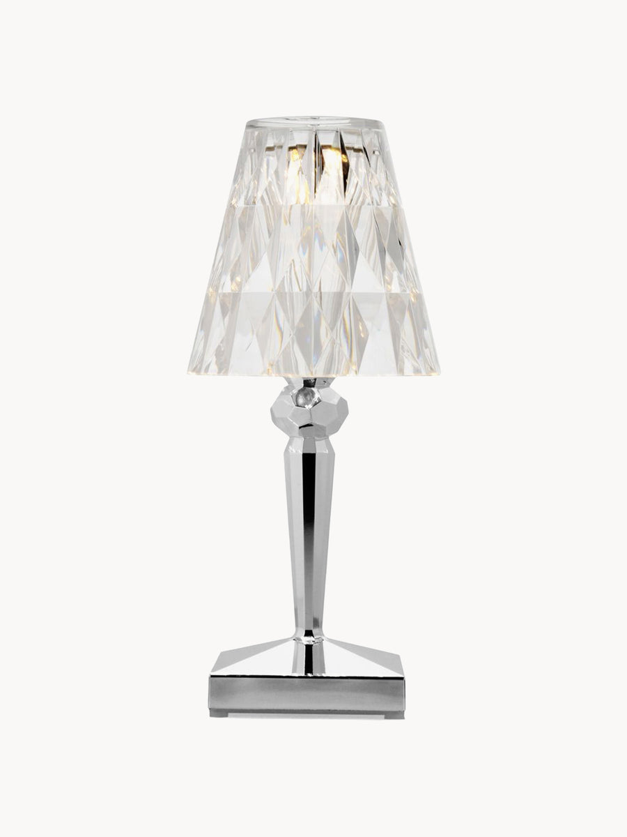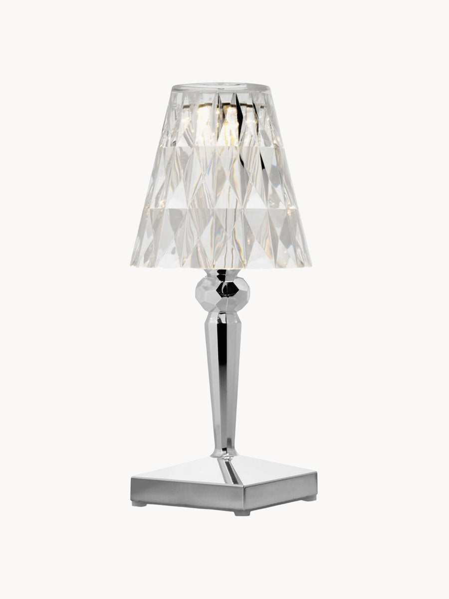 Lampa stołowa BATTERY od projektanta Ferruccio Lavianiego zachwyca wyjątkowymi refleksami światła, które zmieniają się w zależności od kąta patrzenia na spieczony klosz.