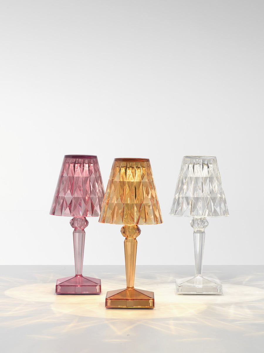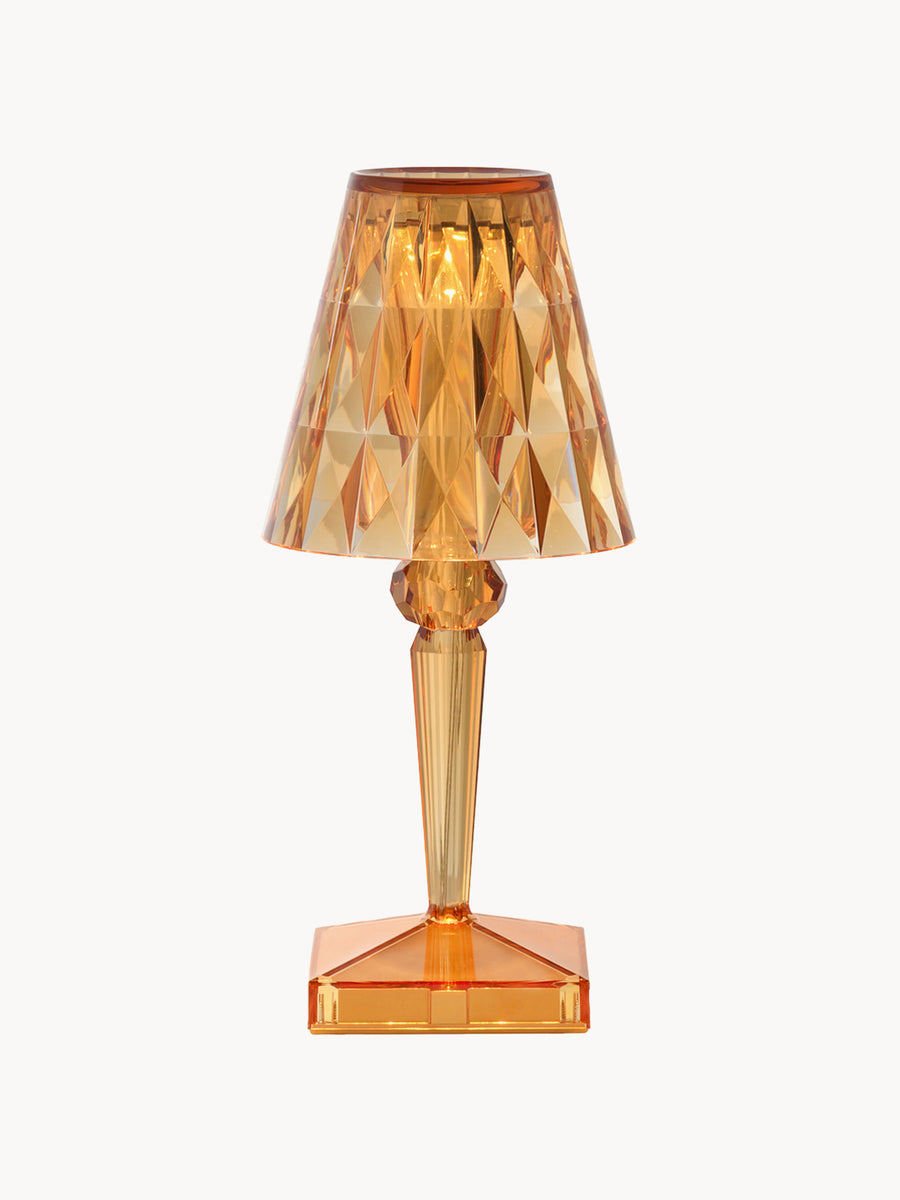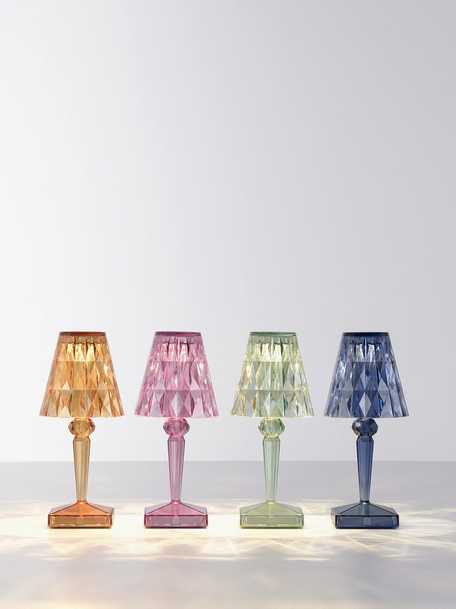 Lampa stołowa BATTERY od projektanta Ferruccio Lavianiego zachwyca wyjątkowymi refleksami światła, które zmieniają się w zależności od kąta patrzenia na fasetowany klosz i tworzą zaskakującą grę świateł.