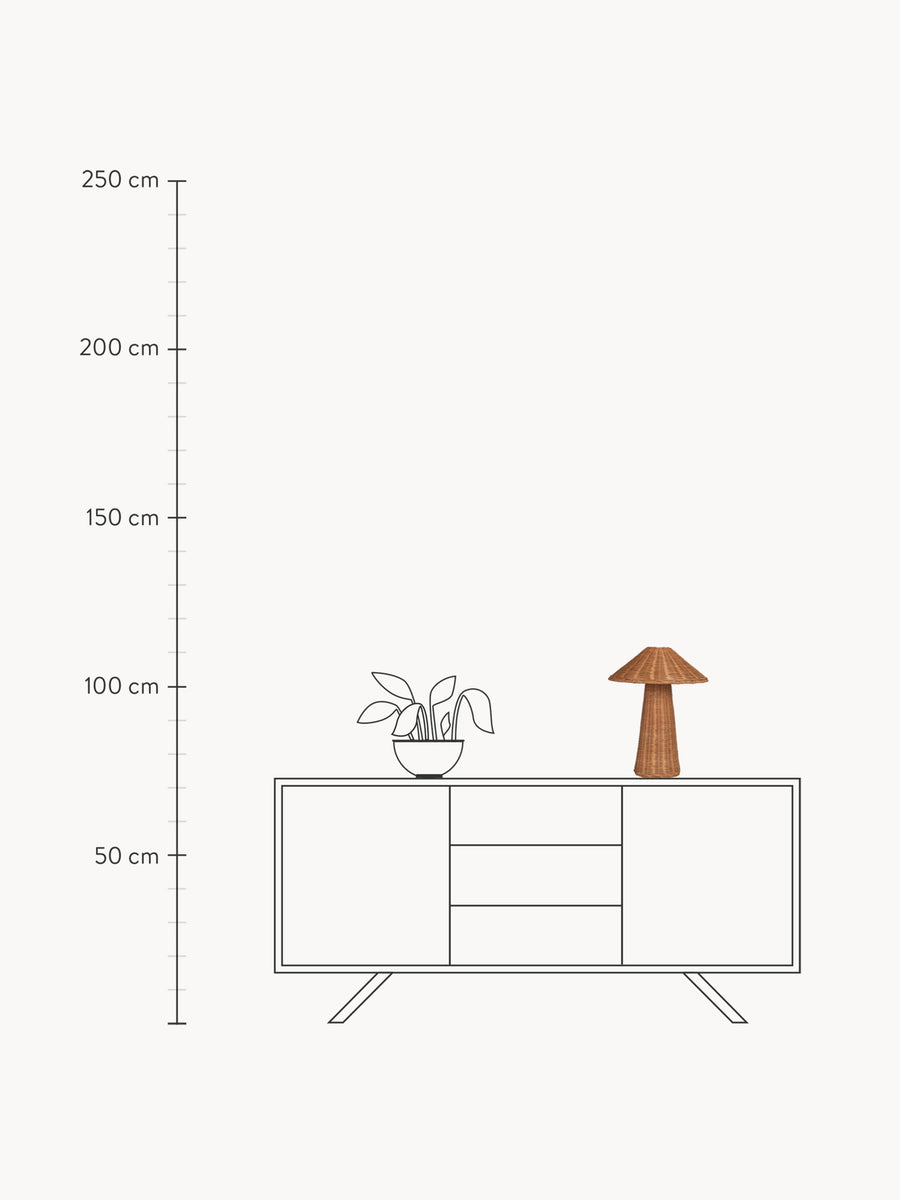 Seria Dou jest ręcznie wykonana z naturalnego rattanu i przedstawia atrakcyjny kontrast pomiędzy geometrycznymi kształtami, a organicznymi właściwościami materiału. Lampa zapewnia miękkie, delikatne światło, które przedostaje się przez pleciony rattanowy klosz, dodając tekstury i charakteru Twojej przestrzeni.
